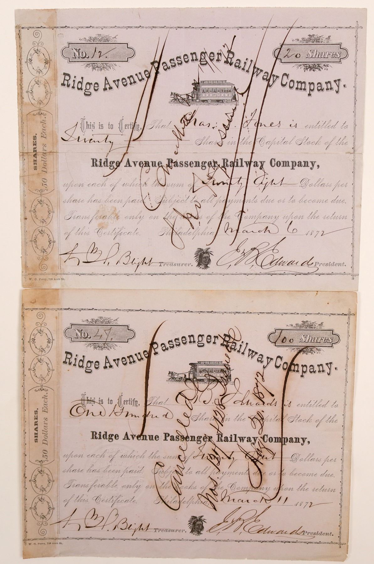 2 total certificates. Both are signed and cancelled by E.R. Edwards, president; in good condition; some discoloration. Prag Collection.