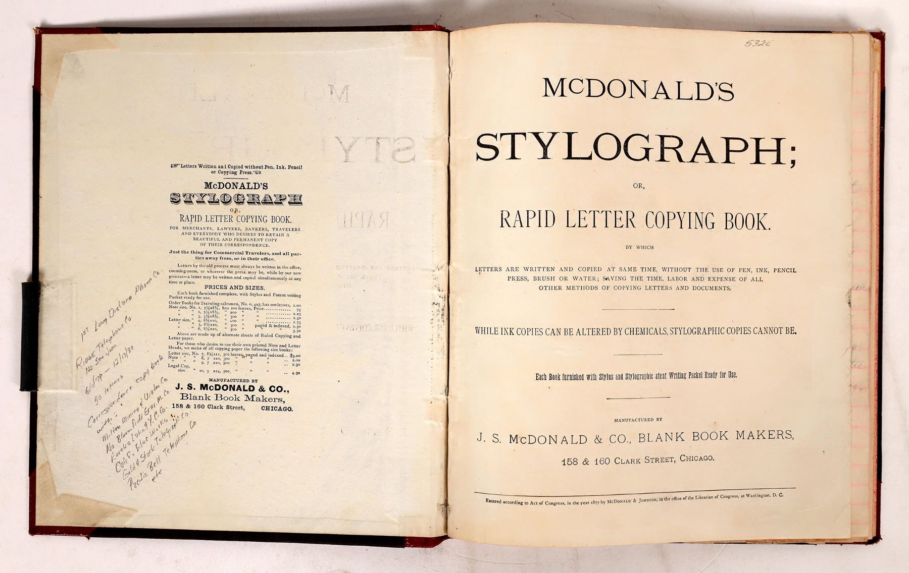 c. 1879-80 Ridge Telephone Company letter copy book. Contains about 50 letters to various mining, utility and telephone companies. "When Alexander Bell patented the telephone in March 1876, mine operators saw the potential this technology could have. In 1877, the Ridge Telephone Company built the world’s first long-distance telephone line. A single disaster once wiped out a quarter of California properties and spurred major changes to the capital. The line ran 58 miles from alpine French Lake to the now-ghost town of French Corral with connections to North San Juan, North Bloomfield and other mining locations down the line. This new technology allowed the mining companies to better communicate their water needs from the 100-mile-long ditch that fed their hoses. When the mines were closed in the 1880s due to new environmental laws, this telephone line allowed the mines to continue operations without government inspectors knowing. The nation’s first environmental law resulted from destructive California mining operations. When one of these agents would arrive in town, the mine operator would call up and down the line to let the other mines know to shut down and send everyone home to make them look non-operational." from fox40.com. San Juan California