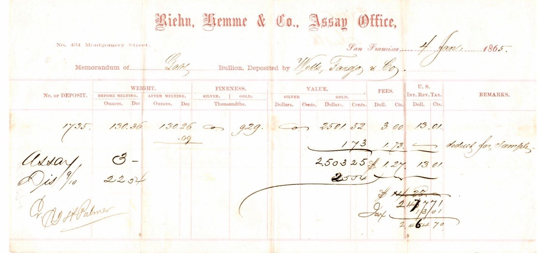 Riehn, Hemme & Co., Assay Office, San Francisco, CA, Jan 4, 1865 - No. 1735 Assay Receipt. for gold bullion bar deposited by Wells Fargo and Company. The piece is signed by Palmer, perhaps indicating that the bar went through C.T.H. Palmerís bank at Folsom . Red on white form. Located on434 Montgomery Street. Palmer handled much of the placer gold produced from the region around Folsom including famous locals such as the Mormon Bar. Assay result as follows: Weight before melting 130.36 oz, After melting 130.26 oz, Fineness .929, Value $2503.25. In addition to fees there is a column for U.S. Internal Revenue Tax which on this transaction amounted to $13.01 Extremely Fine. Very Rare. Riehn, Hemme & Co., Assay Office, San Francisco: 1862-1882. Charles F. Riehn and August Hemme opened an assaying business in late 1862 or early 1863. The company had an office in the heart of the San Francisco financial district at 434 Montgomery near the corner of Montgomery and California, directly across the Street from the Wells, Fargo & Co.'s bank and express office. Prominent gold rush assayers Henry Hentsch and Francis Berton also had an office in the same building as Riehn and Hemme, possibly across the hall, but moved out within the next year. Riehn & Hemme's lab and processing facilities were located at 408 Montgomery and 1 Sumner Street. By the end of the Civil War in 1865, Riehn & Hemme were one of a dozen assaying firms in San Francisco. Riehn & Hemmeís business was located in the center of the mining and business district of San Francisco. The building directly across the street at 422 Montgomery housed no less than a half dozen mining stockbrokers. Orville Ames, and three others, ran a mining stock brokerage next door. Charles Sutro, Adolph's brother, ran a gold dust and bullion brokerage business located immediately across the street from Riehn & Hemme. Kellogg & Hewston, perhaps the best-known California Gold Rush assay firm of the period, was located just a few doors down the street at 416 Montgomery. In the early 1870's, Riehn & Hemme centralized their business to the 404 Montgomery location, where they stayed for another decade, until selling out to F. Reichling about early 1882. The two decades they were in business was a long stretch for any California Assaying firm. Size: 5.25 x 11 inches. Check the Mining Section for other RARE California Assayer documents. San Francisco California Franklin Collection