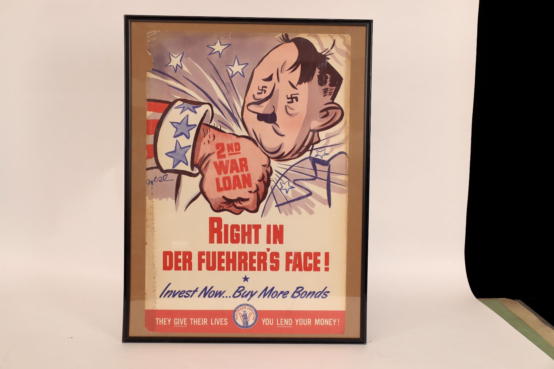 WWII Poster based on the classic Spike Jones song in Der Fuehrer's Face. It is a second war loan poster to buy war bonds. Some damage along left edge. Crudely framed, poster itself is 15" x 22.5" Spike Jones was known for his humorous tunes during WWII designed to raise American's spiritus.