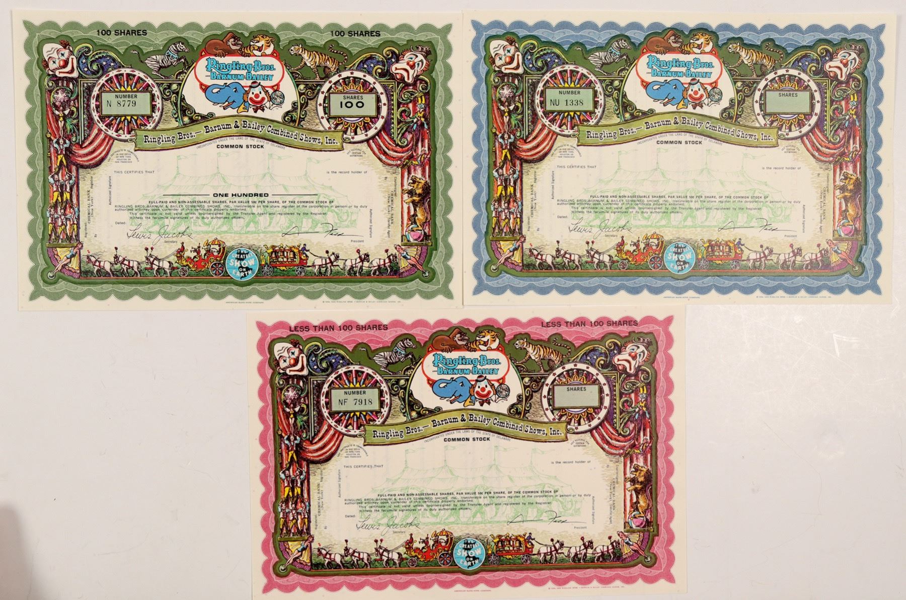 3 Unissued stock certificates for Ringling Bros - Barnum & Bailey Combined Shows, Inc. Excellent condition in striking full color. One in each color: red, blue and green. Inc. Under the Laws of Delaware. Printed: American Bank Note Co. Ringling Bros. and Barnum & Bailey Circus, formerly Ringling Bros. and Barnum & Bailey Combined Shows also called "The Greatest Show on Earth." Was an American circus that was the best-known traveling circus in the US in the 20th and early 21st centuries. Operations ceased in 2017. It and its predecessor shows ran from 1871 to 2017. Known as Ringling Bros. and Barnum & Bailey Combined Shows, the circus started in 1919 when the Barnum & Bailey's Greatest Show on Earth, a circus created by P. T. Barnum and James Anthony Bailey, was merged with the Ringling Bros. World's Greatest Shows. Ringling brothers had purchased Barnum & Bailey Ltd. following Bailey's death in 1906, but ran the circuses separately until they were merged in 1919. With weakening attendance, many animal rights protests, and high operating costs, the circus performed their final show on May 21, 2017 at Nassau Veterans Memorial Coliseum and closed after 146 years. State: City: Date: