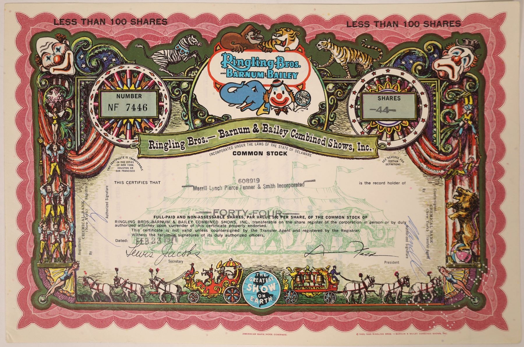 One of the most colorful stock certificates! Vignettes include clowns, lions, acrobats, tigers, horse zebras, etc. Green underprint shows elephants and circus tents. In extremely fine condition, never folded, issued to Merrill Lynch. High quality printing by American Bank Note.