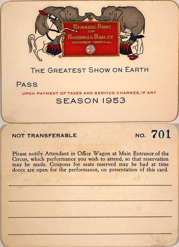 Uniussed, very colorful and pictorial. Pass for the 1953 season. "The Greatest Show on Earth." Vignette of elephants, a clown and a horse. Gilt edges, thick cardstock. Very good condition. 2.5 x 3.75" (Potter Collection) Date: Location: Baraboo, Wisconsin HWAC# 60344