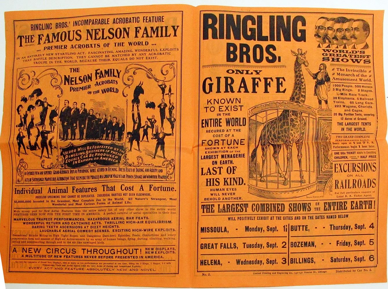 Orange paper 4pp 14" x11" Ringling Bros promo flyer boasting a tremendous equine ballet militant and a moving sea of color, grace and grandeur. The grandest, biggest, best show on earth!. Featuring the Famous Nelson Family, premier acrobats of the world and more. Date unknown. Performances in Missoula, Great Falls, Helena, Butte, Bozeman and Billings. Date: Location: Circus, Montana HWAC# 571419