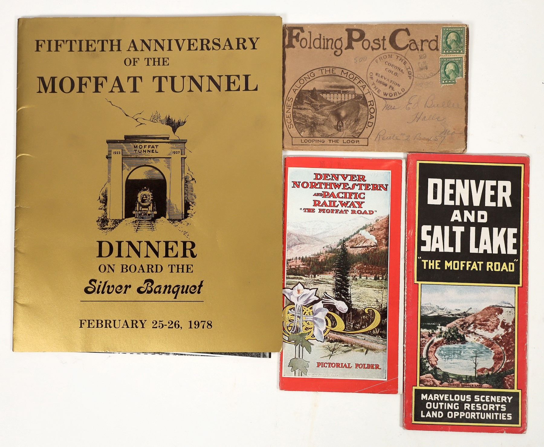 A menu, brochure and other ephemera, mostly celebrating the 50th anniversary of the Moffat Tunnel on February 25-26 1978. Group includes a menu, photos and flyers. All in nice condition. Please see photos for more details.
