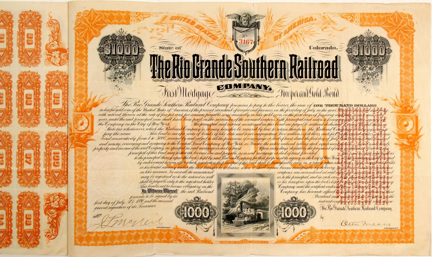 Uncancelled #3167 $1000 first mortgage 5% gold bond signed by Otto Mears. Prag Collection. State: City: Date: 1890 HWAC# 84203