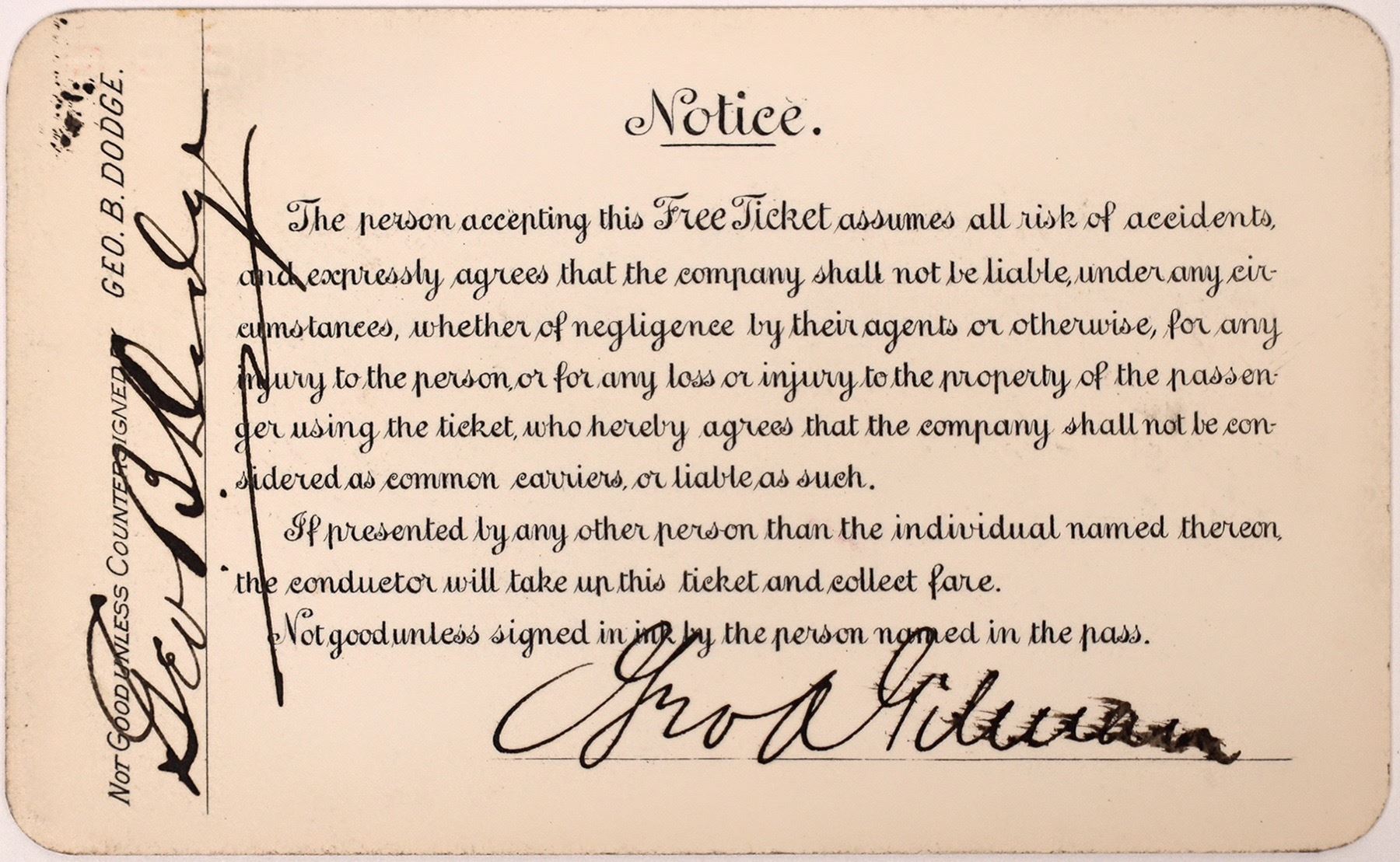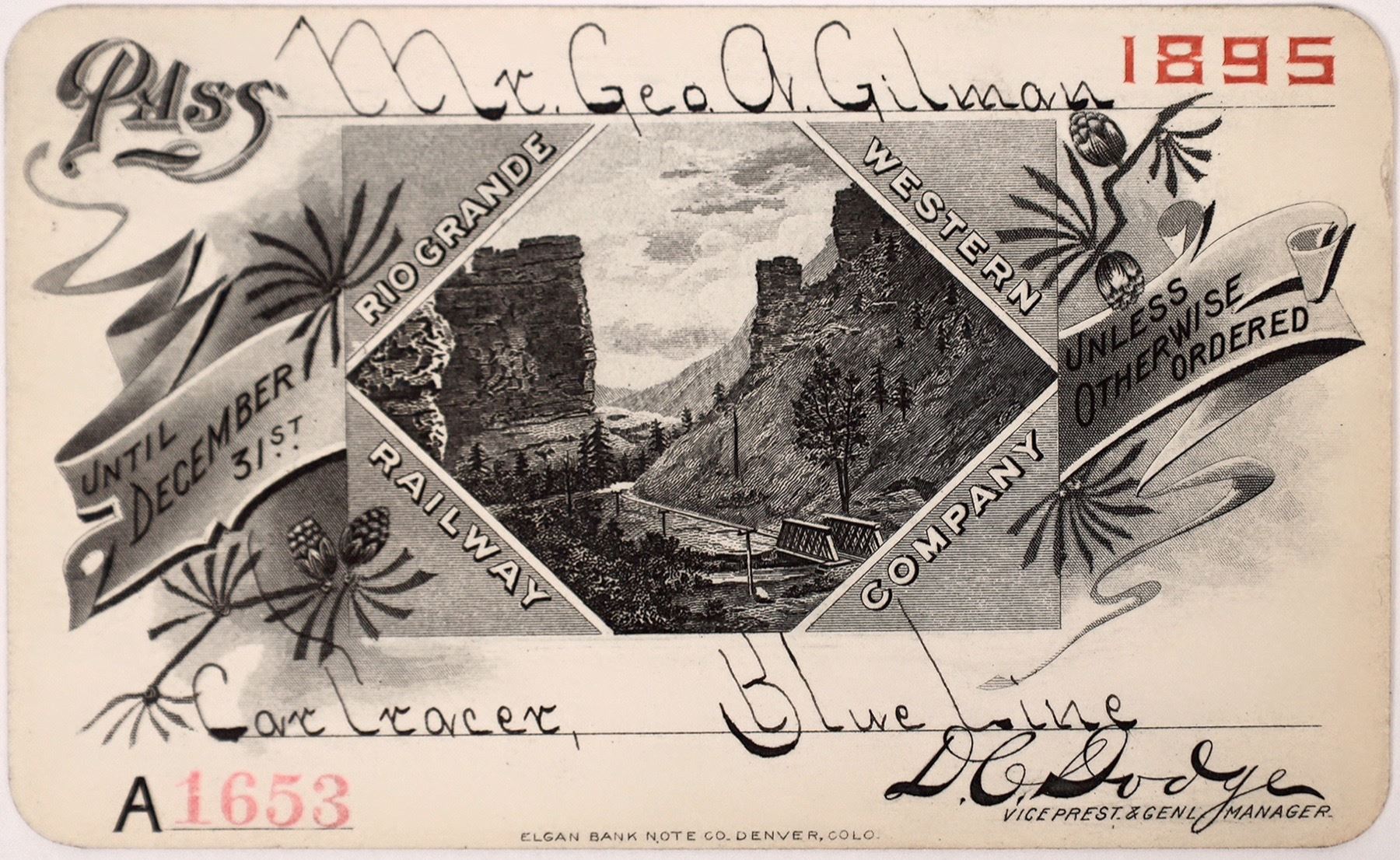 Rio Grande Western Railway Co. pass dated 1895. The front pictorial is a railway through a canyon view. It is signed by D.C. Dodge and countersigned by Geo. B. Dodge on back. No. A1653. A very nice pass. On top it says it is issued to Mr. Geo. A. Gilman and on the line below the pictorial it says Blue Line. Please see photos!