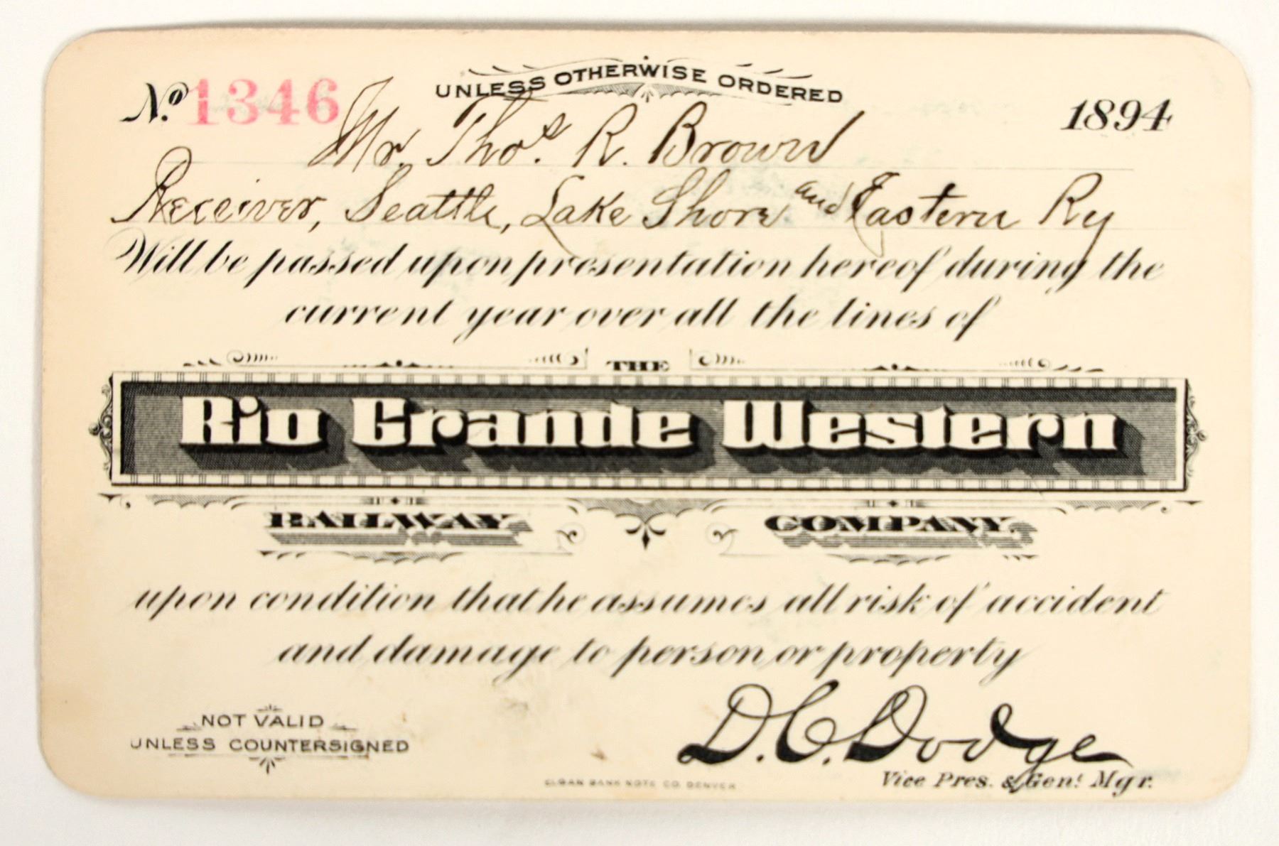 Rio Grande Western Railway Co. pass dated 1894. Signed by D.C. Dodge, Vice president & General Manager. May be the same or related to Grenville Mellen Dodge, who was instrumental in the construction of the Transcontinental Railroad. Pictorial on back has a little staining and is of a canyon pass. No. 1346. Please see both sides in photos.
