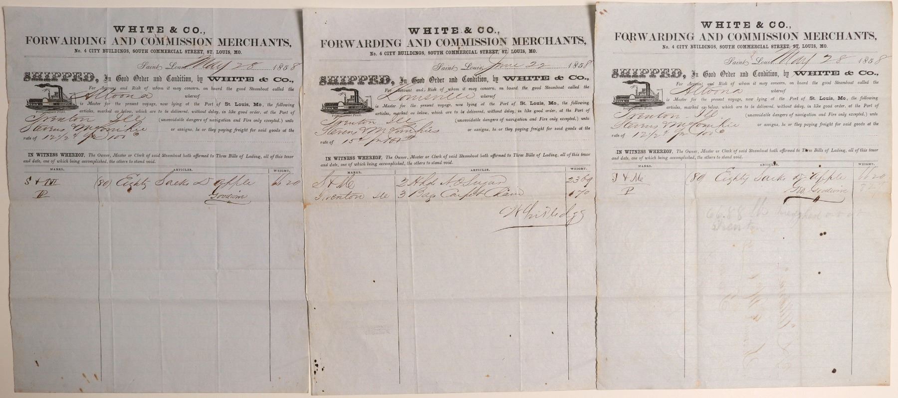 Lot of three pieces from White & Company with steamship vignette with shipping orders from the port of St. Louis, Missouri.