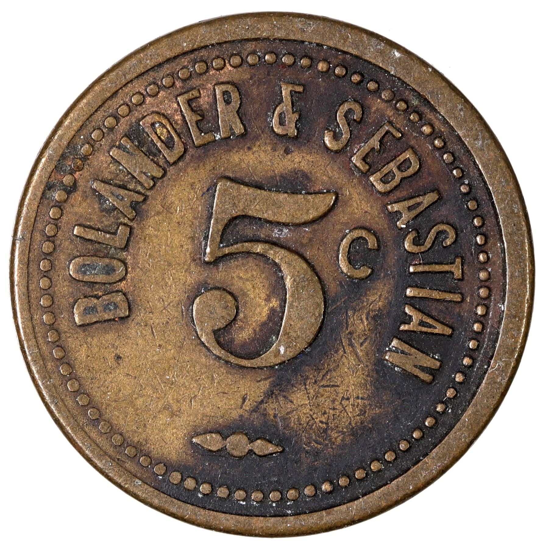 Very rare billiard hall token: RIVERDALE / BILLIARD / HALL / RIVERDALE, CALIF. // BOLANDER & SEBASTIAN / 5c; Br. rd., 21 mm. [Riverdale] [California]