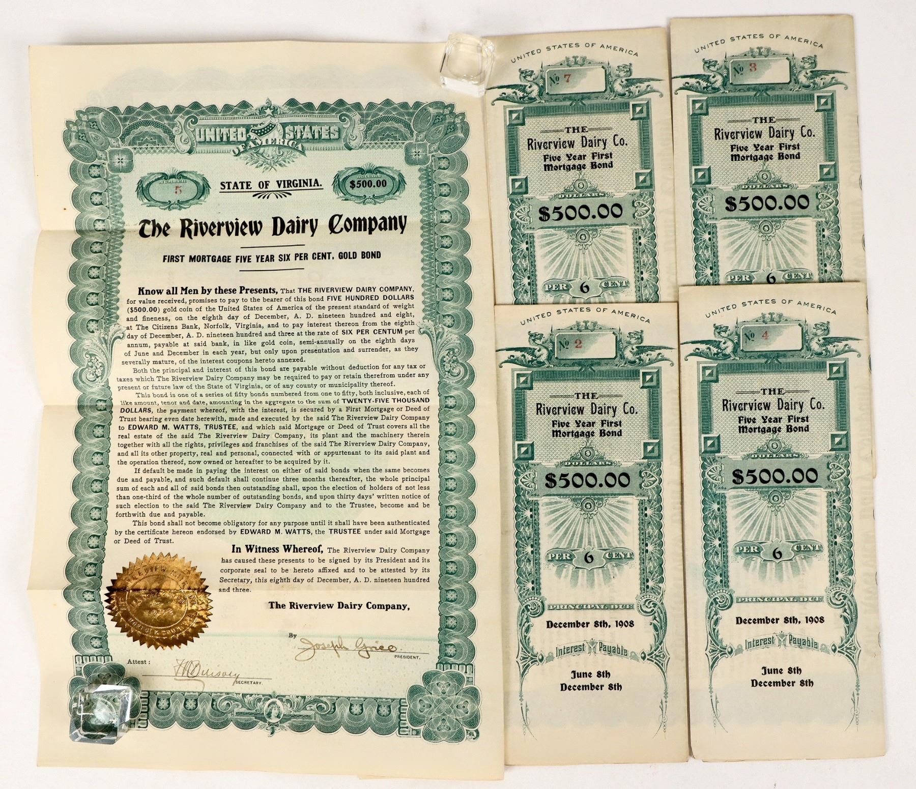 This lot has five bonds from the Riverview Dairy Co. of Norfolk, Virginia. Please see photos for details.