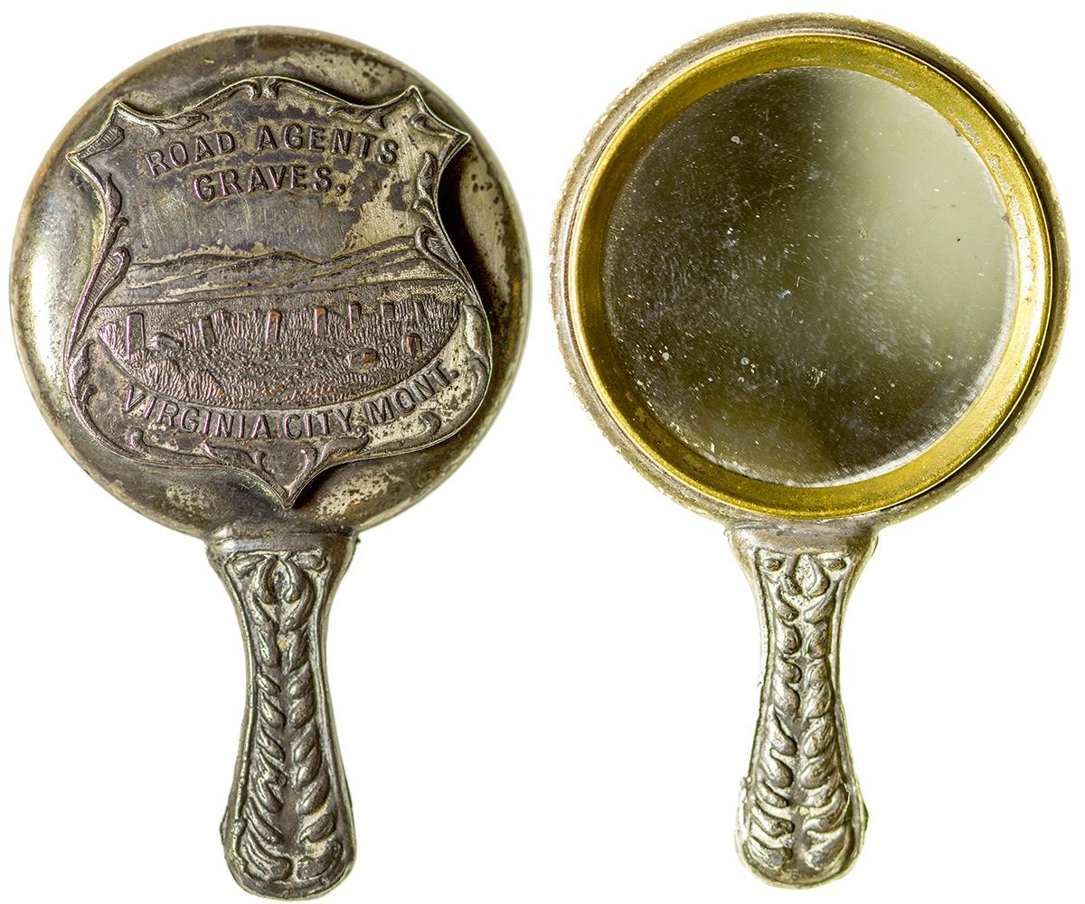 Beautifully embossed small silver plated mirror, 1.5" diameter with 1" handle. Raised image of highway route outline with image of mountains with the city in foreground. "Road Agents Graves / Virginia City, Mont." Very good condition, mirror clean. Road agents hung in 1864 by vigilantes near present day Stevensville. (Svoboda Collection) City: Virginia City State: Montana Date: HWAC# 33857