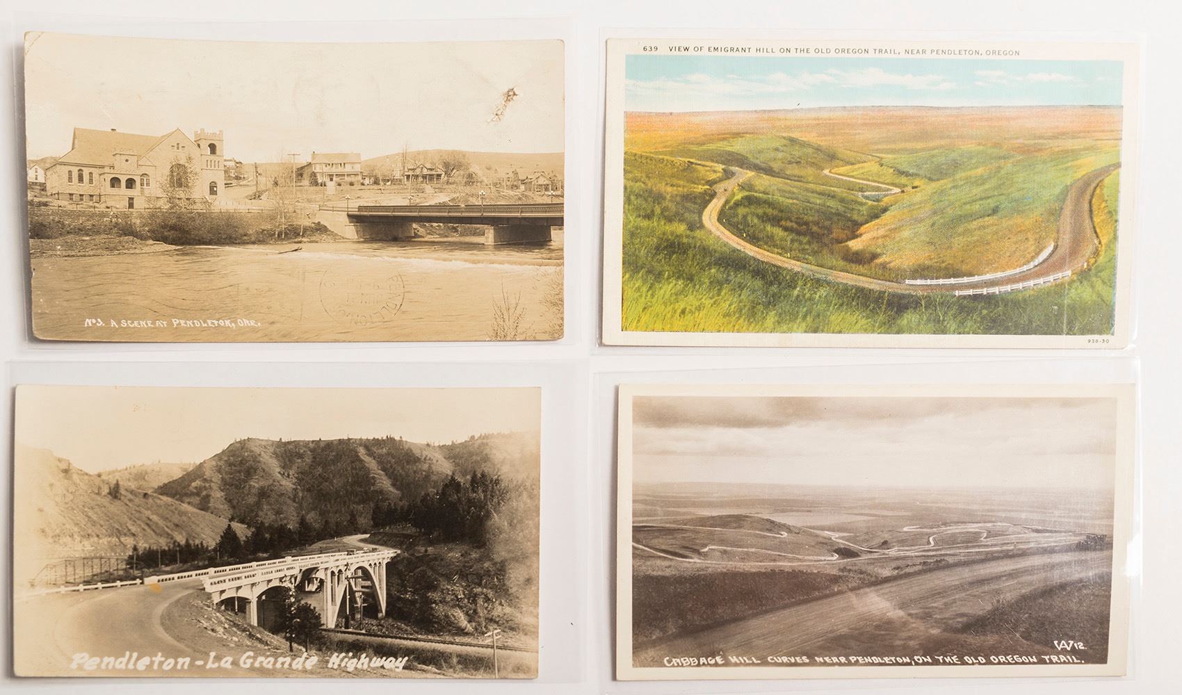 Lot of four. Three black and white RPC's: Cabbage Hill on the old Oregon Trail, early 1912 bridge over a river (some damage in upper right), and La Grande Highway. A color postcard of the winding road that followed the Oregon Trail. Date: Location: Pendleton, Oregon HWAC # 54028