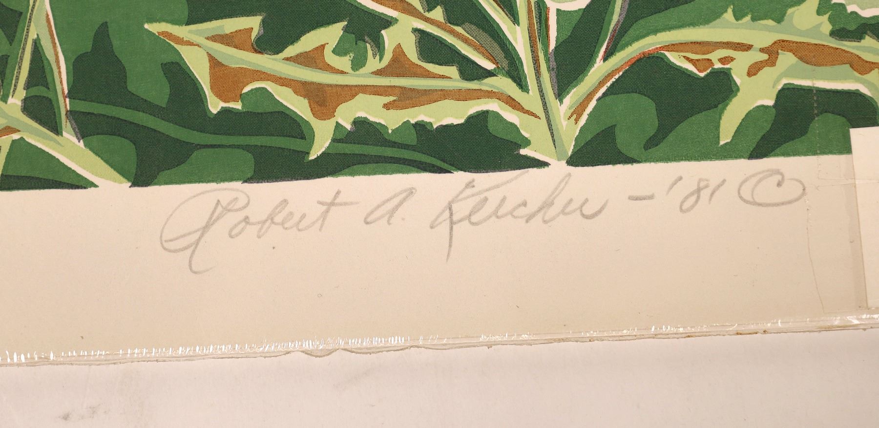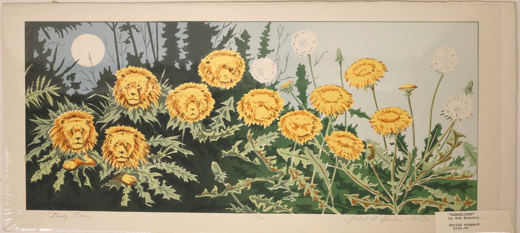 Serigraph by Robert A Kercher of dandelion flowers morphed into lions, numbered. 10/84.