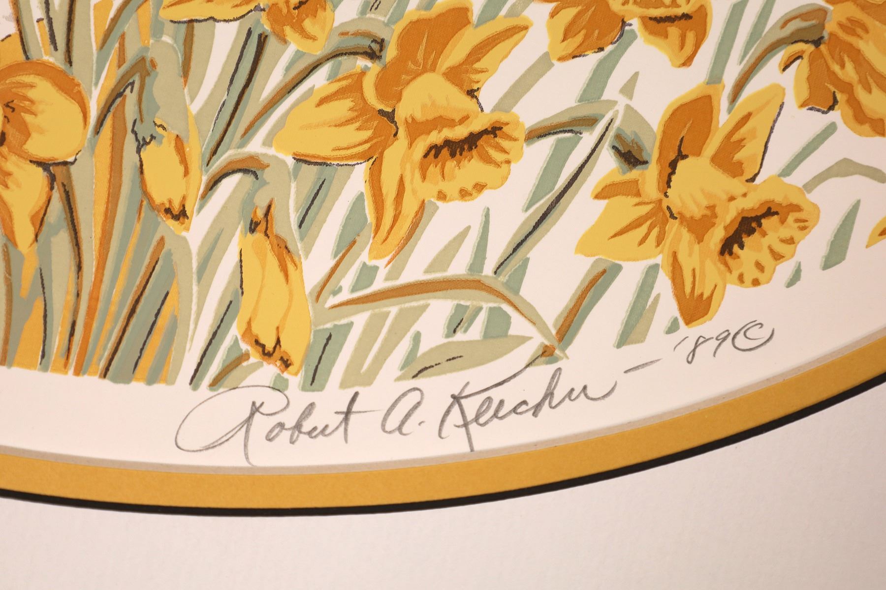 Oval serigraph print--17/85 by Robert A. Kercher. Rabbits and daffodils.