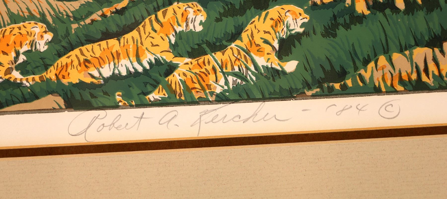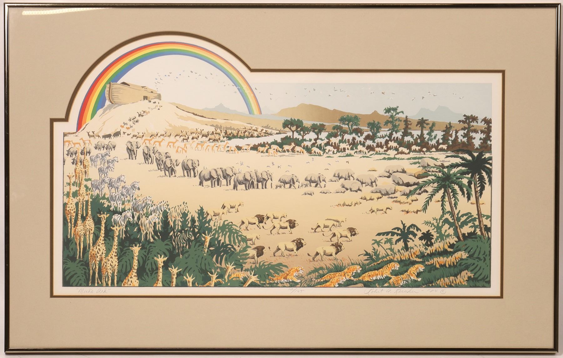 Serigraph print titled Noah's Ark, numbered 12/105. Parade of various animals leaving the ark. Matted and framed. "Bob's original serigraphs and prints deviate from realism to a means of graphic story-telling. Each print deals with the "permutation" of one image turning into another. They often highlight the camouflaging aspects of natural colors surprising the viewer with transformations from shape to shape in a rhythmic progression across the composition." (Courtesy Kercher)