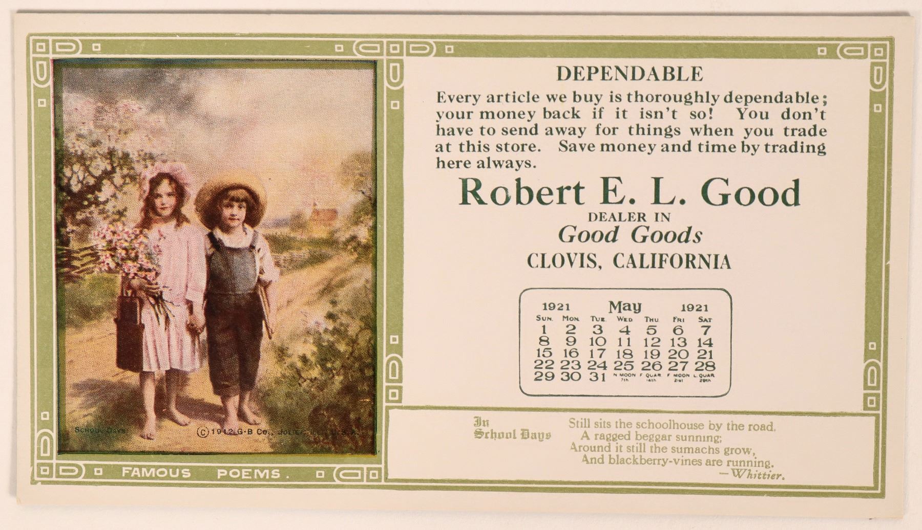 Artsy blotter from Robert E.L. Good, Dealer in Good Goods, Clovis, California. Below May, 1921 calendar is the poem, "In School Days" by Whittier. Painting at left titled, "School Days". No artist listed. Copyright, Joliet, Illinois.