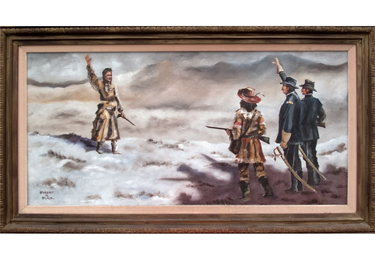 #145. "Nez Perce surrender to General Mills in 1877." 20" x 40" framed. Blair was born and raised in California. He first attended the Chouinard Art Institute in Los Angeles from 1960 to 1962, while at the same time working for the Los Angeles Examiner in the art department. He attended the Art Center in Los Angeles from 1963 to 1966 where he developed his first work in the fine arts field. After moving to New Mexico in 1988, he taught oil painting classes at San Juan College in Farmington. He understands what the early artists saw in New Mexico with the blazing blue skies and magical light.