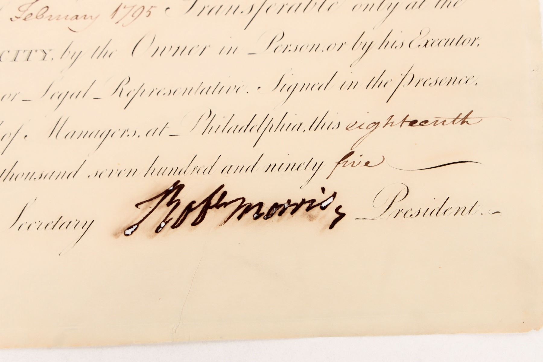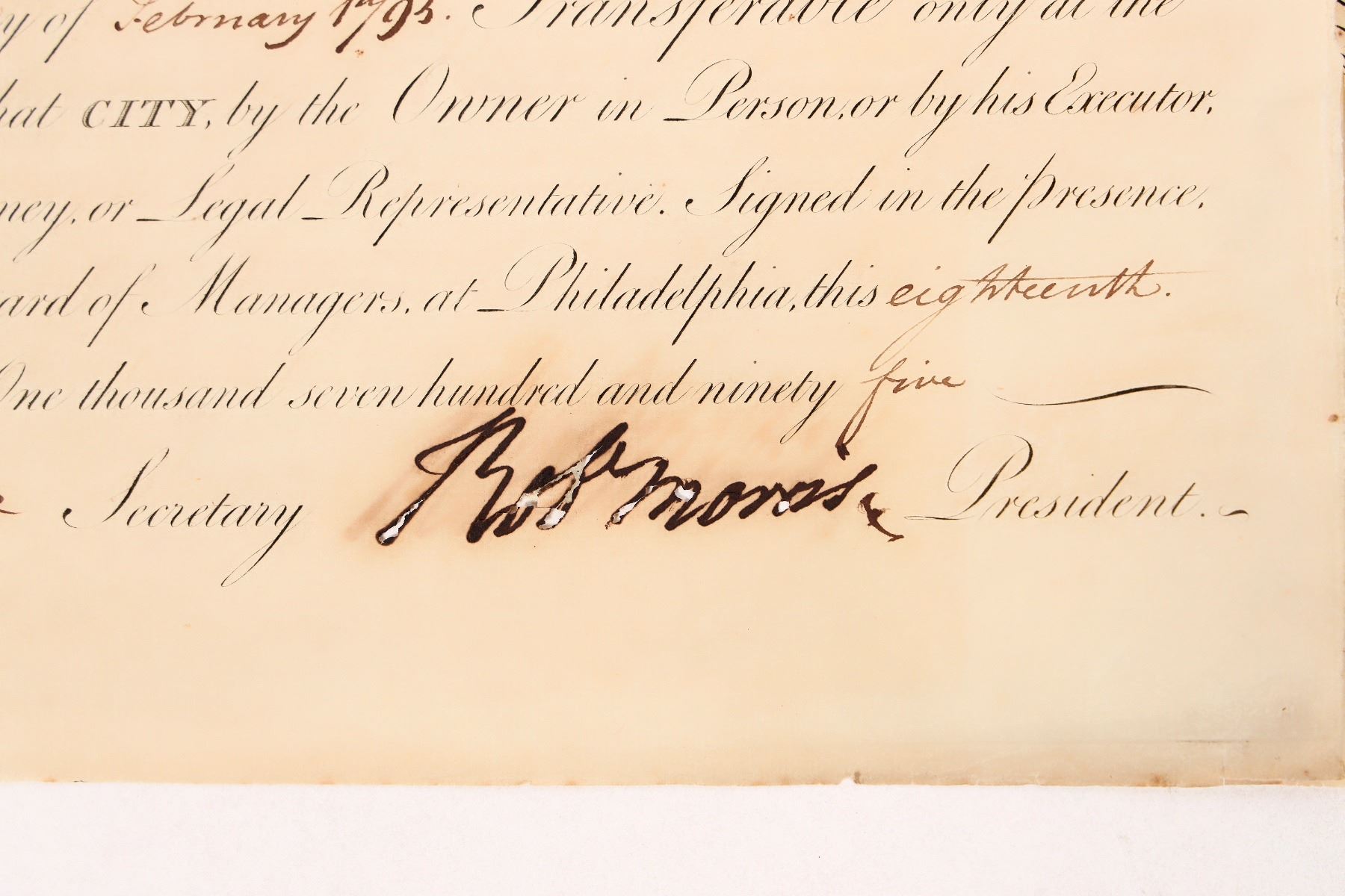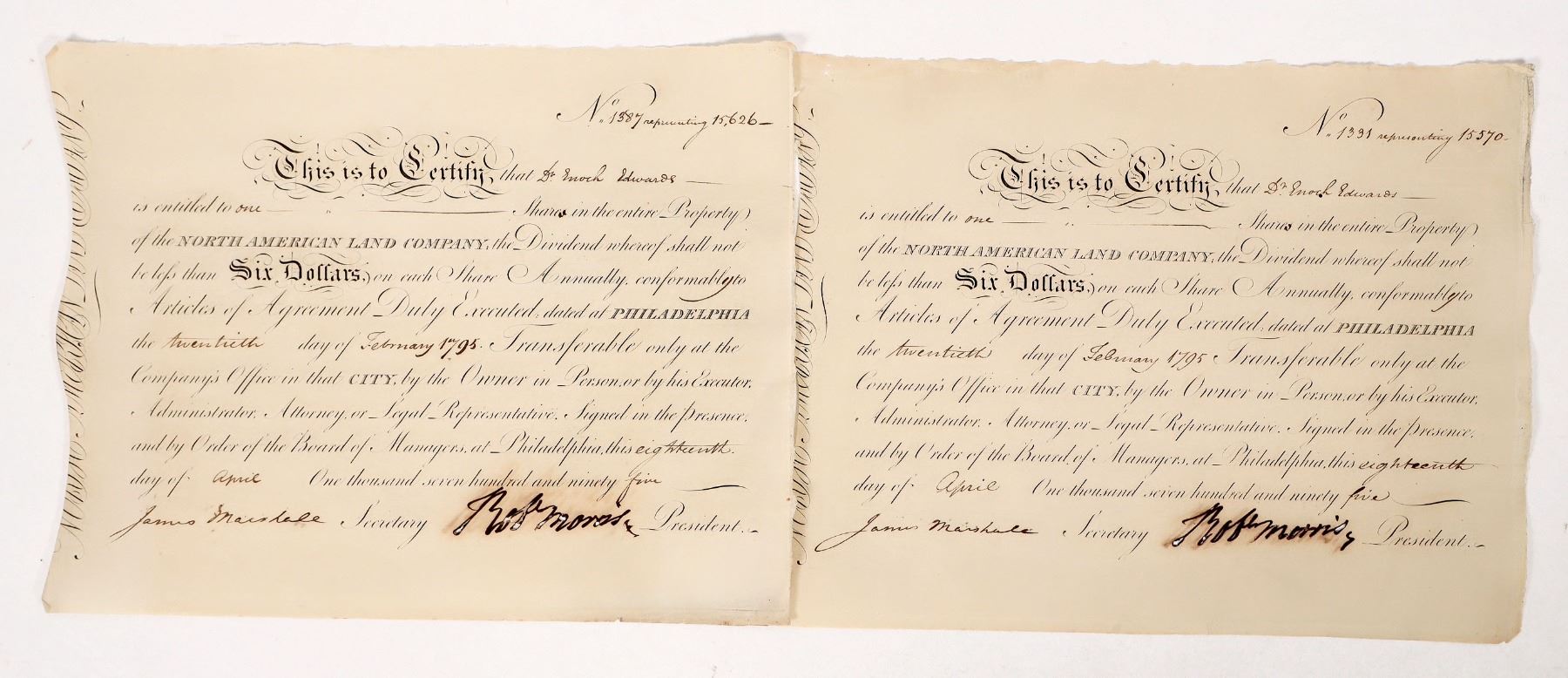 2x 1795 North American Land Company stocks signed by Robert Morris, a signer of the Declaration of Independence. His pen used acidic ink and there is some perforation damage on his signature. Please inspect.