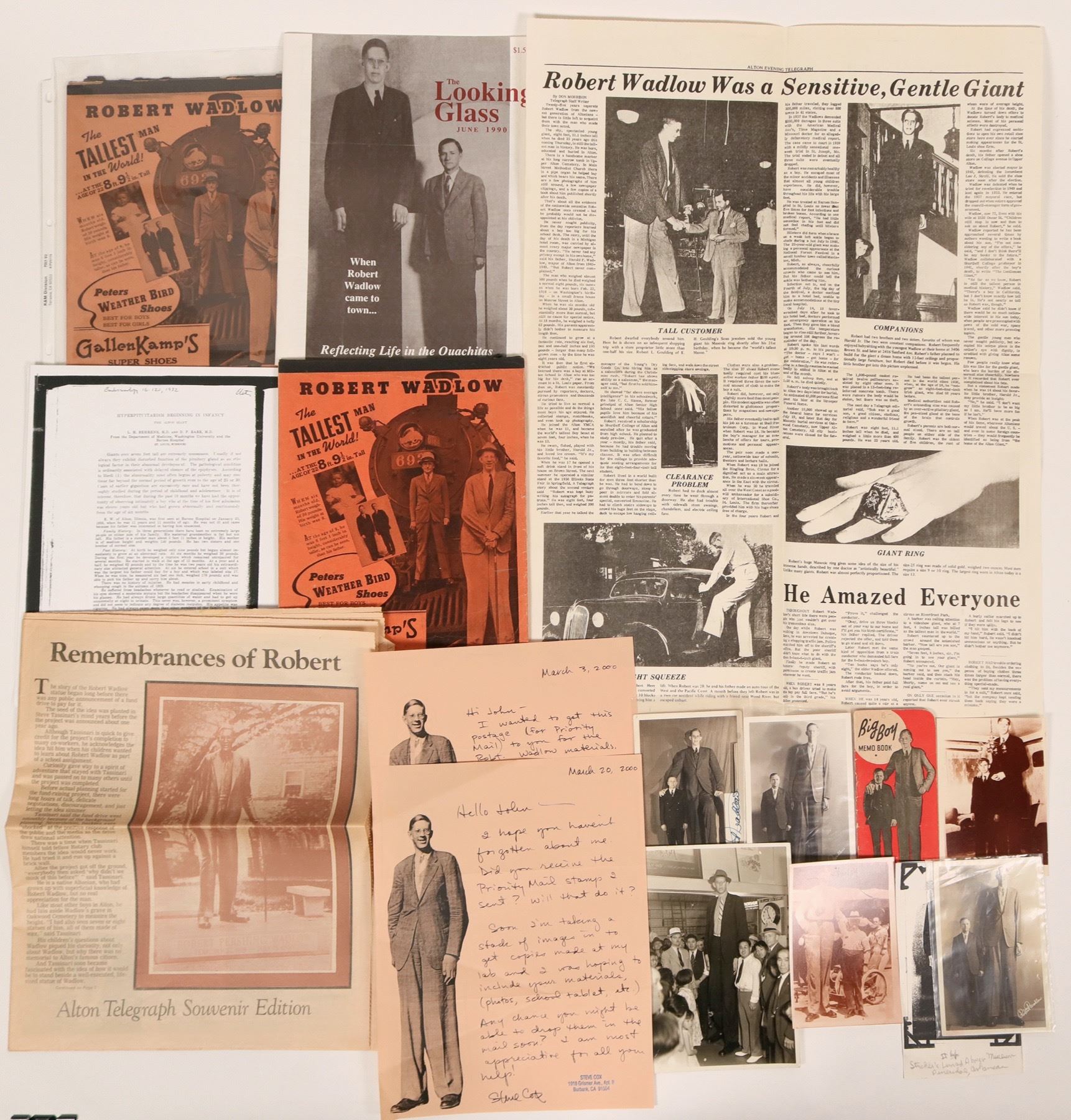 Robert Wadlow was known as the Alton (Ill.) Giant and the tallest man on the North American Continent. Born in 1918 and lived until 1940. He was diagnosed with Hypopituitarism at age eleven. Our ephemera includes a facsimile of the diagnoses from the Endocrinology journal pgs. 120-126, 1932. Several photographs, one actual newspaper account and one photo copy account. A copy of the Looking Glass periodical details his visit to Arkansas. Amazingly, Robert weighed 44 lbs. as a toddler at one year old. Please see photos for the complete package.