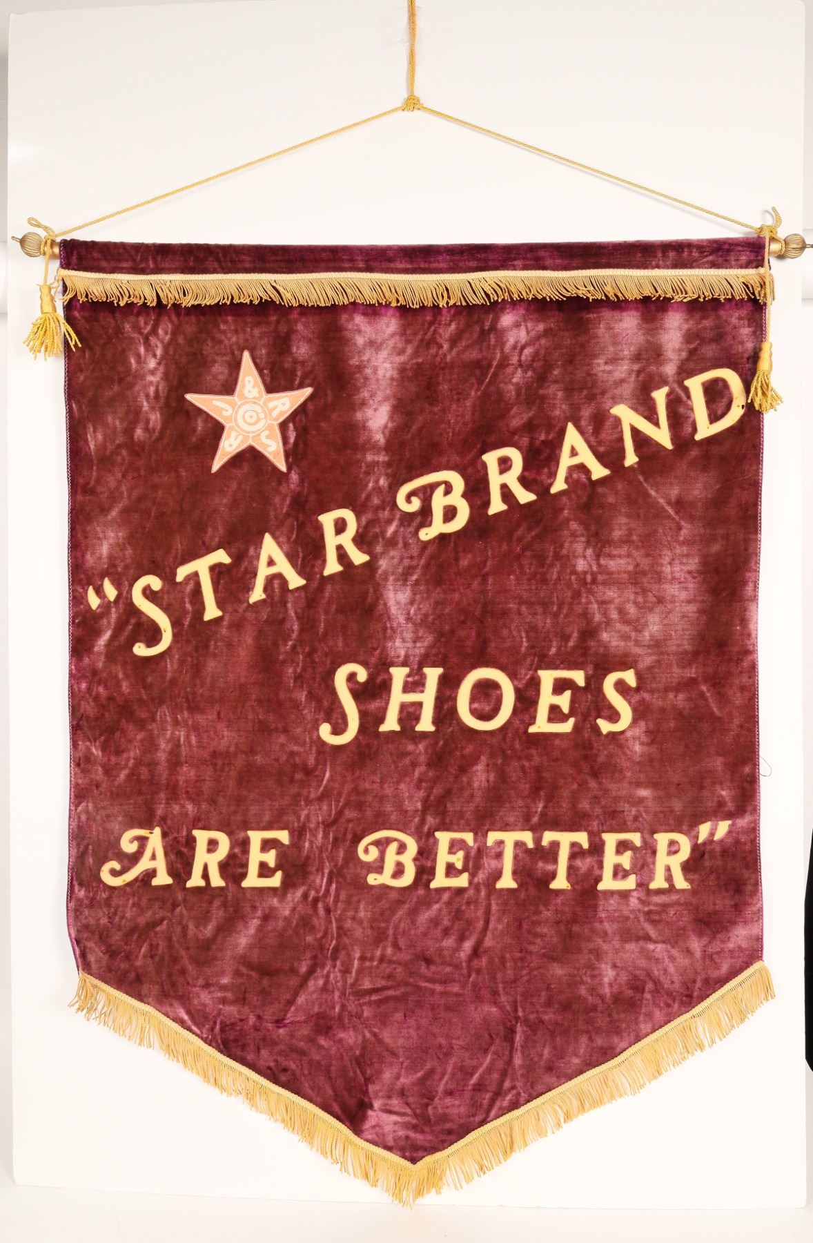 This is a hanging banner for the Roberts, Johnson and Rand Shoe Company of Hannibal, Missouri. Incorporated in 1899; the star was their logo. They made shoes first for men and later included fashion shoes for women by Beverly Hixson as well. One of the largest shoe manufacturers in the nation in 1905. Red velvet and cream colored wool. 40 in. X 45 in.