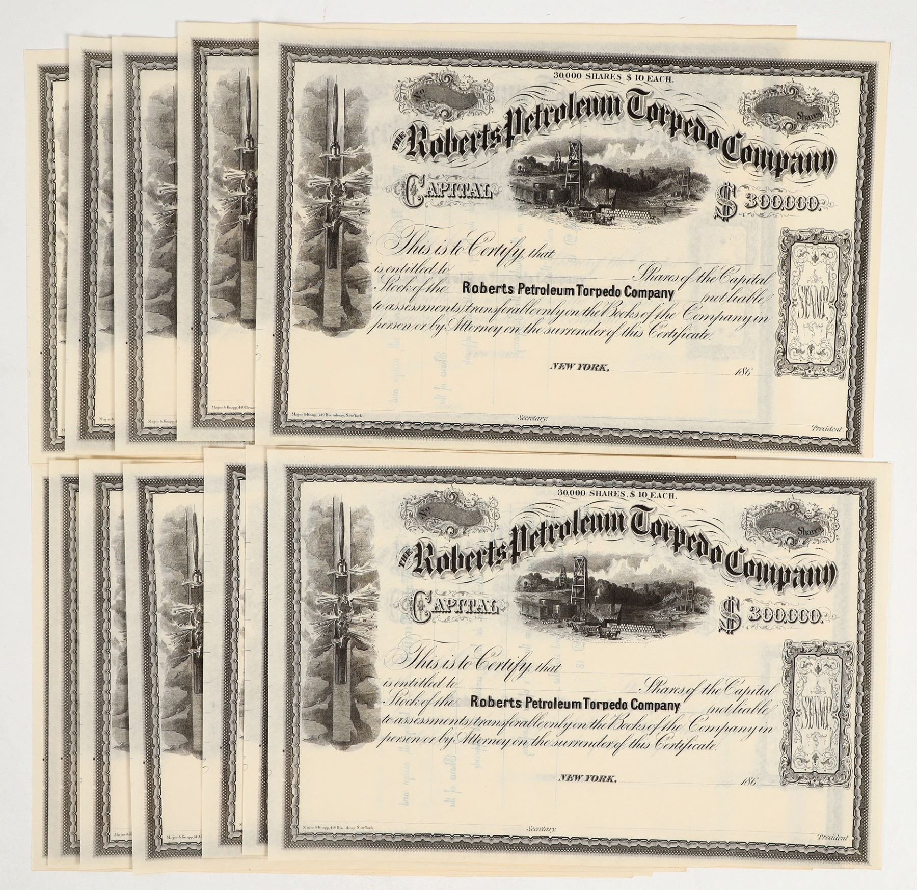 Lot of 11 unissued stocks. This has to be one of the more unusual stock certificates we have offered for sale. Two vignettes. The first shows an 1860's oil well scene. The second shows how this petroleum torpedo worked. This was the brainchild of a dentist, Walter Brooke Roberts with the help of this brother Colonel EAL Roberts. This device revolutionized oil production. It was a simple 'torpedo' filled with nitroglycerin that was lowered down a rope and ignited when a large weight was sent down that rope and ignited it. Simple, yes! Dangerous, yes! Easy to copy, yes. For 25 years they would spend a great deal of time and energy fighting patent infringements and "moon-lighters" who produced their own unlicensed varieties. They were call moon-lighters as they would only do this at night to avoid detection from the detectives that were hired by the Roberts brothers to spy on oil fields. It is estimated that as many as 2,000 lawsuits were in court at one time! Explosions in the field, especially with moon-lighters was constant. It is estimated that at least 120 people lost their lives in the factories, warehouses, transportation by wagon, shooters (those who actually sent down the rocket and weight), and even curious bystanders. As one author put it this was fracking before there was fracking.