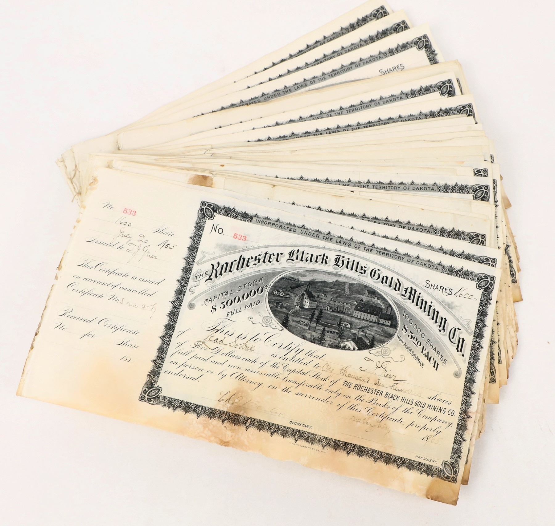 Group includes about 50 issued stocks, 1887-1905, plus at least that many unissued. All have heavy soiling and water damage, like the other examples we have seen. Found by Homestake Mine geologist Dave Shaddrick in a barrel in the mine. Inc. in the Territory of Dakota. Birds-eye view vignette of mines on a hill (Lead City?). 7.5 x 10" Clearly named after Rochester, New York