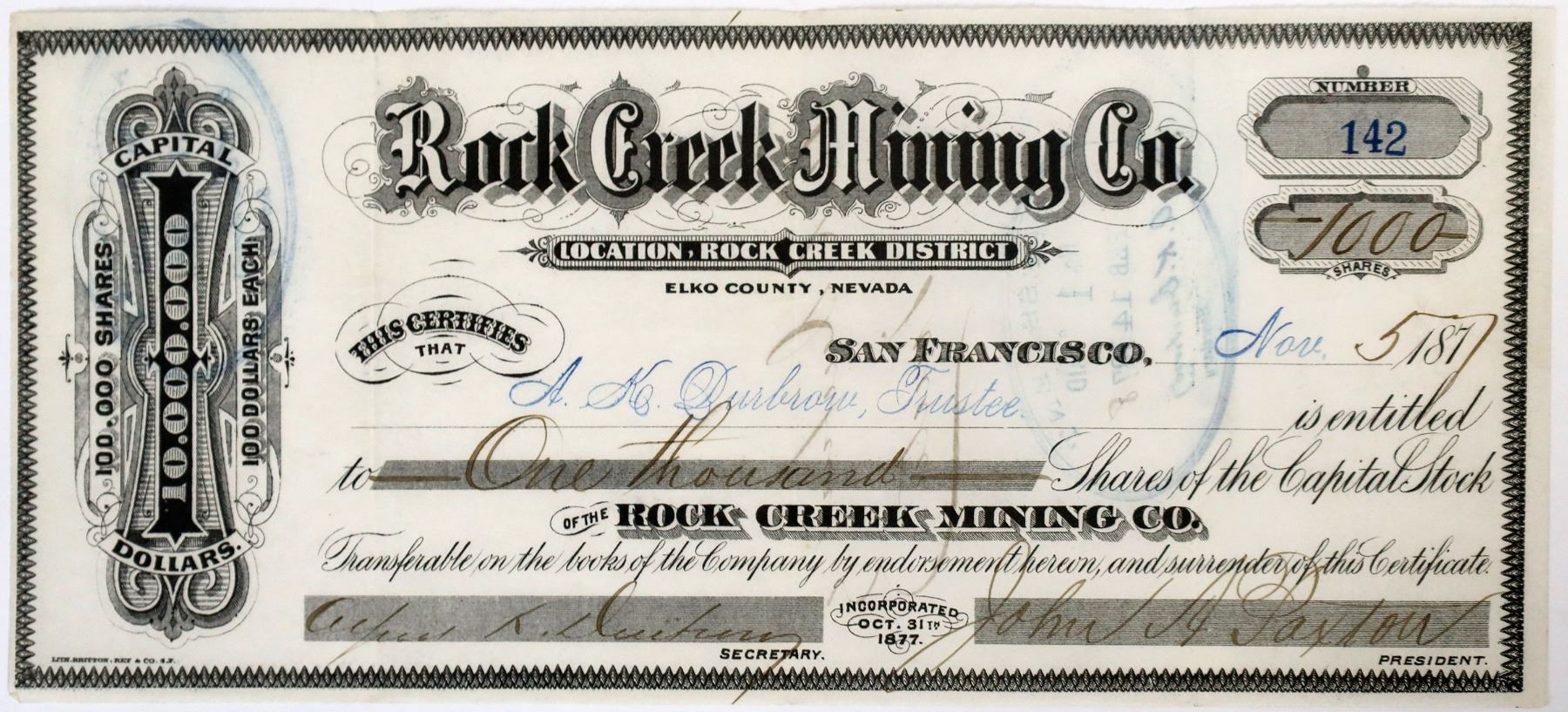 Rock Creek Mining Company stock cert. #142, issued for 1000 shares to A. K. Durbrow trustee and signed by A. K. Durbrow as secretary and John Paxton as president. Issued on November 5, 1877 in San Francisco. Incorporated on October 31, 1877 (Nevada Day). Location: Rock Creek District printed at the top. No vignette. In very good, uncancelled condition. The Rock Creek MC was originally called the Scorpion. It showed promise, but no major production. Located by the short-lived mining camp of Falcon. The Elko papers predicted it would be the next mining camp boomtown, but rising water in the mines and difficult to process ore doomed the city in less than a year. Durbrow was involved with such Comstock mines as the Gould & Curry (secretary for two decades), California and Potosi. John A. Paxton was one of California's richest men ñ acquiring that wealth as president of the Manhattan Silver Mining Company in Austin. Notes on Durbrow, company, district and Falcon included.
