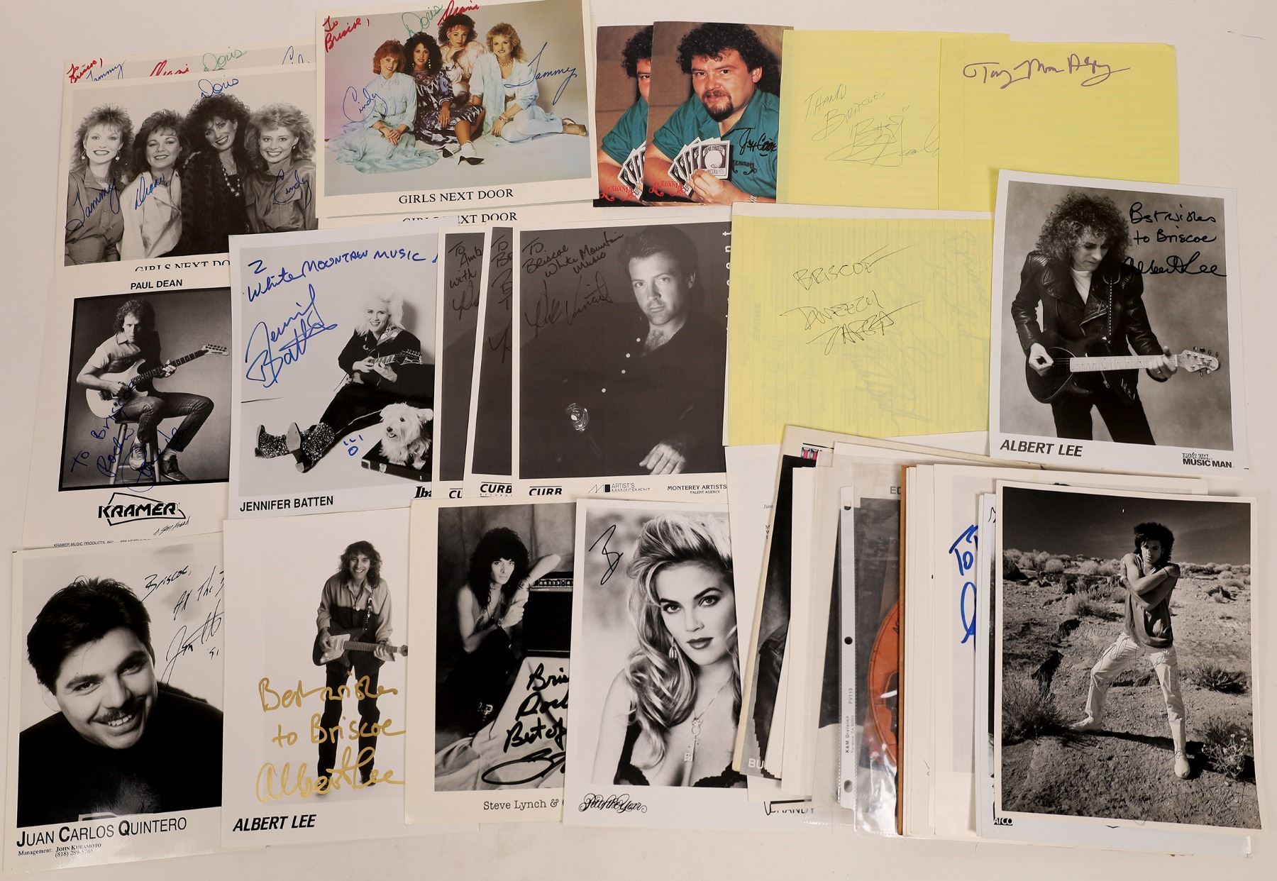 Collection of signed (35) and unsigned (about 15) promo photos of many rock n roll, R&B, Country and other musicians (mostly 8x10) all autographed to Briscoe Sanderson, owner of the Yosemite Trading Post In Lee Vining California next to Mono Lake. Briscoe was a professional (electric) guitar player, whose booming scratchy deep voice was unmistakable. Lost also includes personal letter and other goodies. Some of the people: Girls Next Door, Dio, Jeff Cook (Alabama), Paul Dean, Jennifer Batten, Rick Vincent, and more. Some duplication. Also includes some old guitar ephemera. State:California City: Date: Provenance: