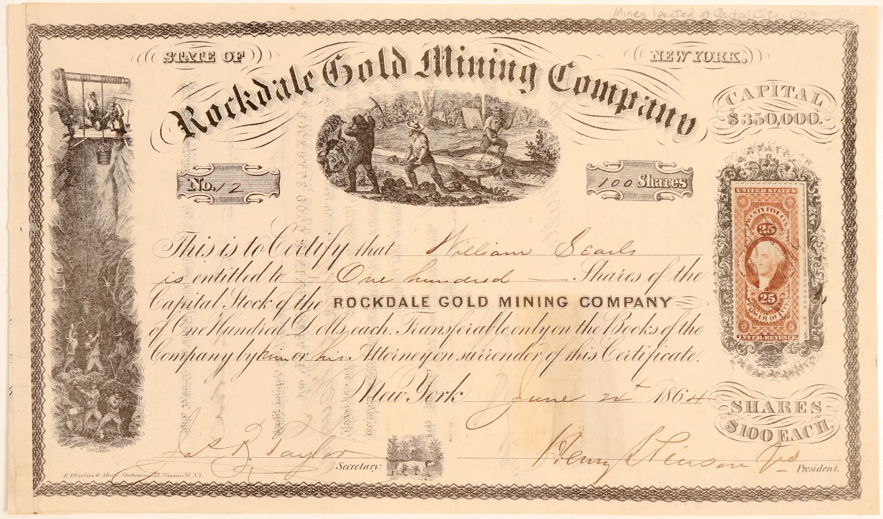 Do not confuse this certificate with the large number of unissued certs. This is a rare early issued cert! Stock Certificate from the Rockdale GMC. Incorporated in New York. Certificate number 12 issued in June 24,1864 at New York to William Seals. Signed by Henry Pinson, and James R Taylor. Printed by BF Corlies, New York. Size 10.5 by 6.5 inches. In Very Nice condition. Not cancelled. Three vignettes: hoist scene, placer mining scene, small dog. 25c Power of Att'y revenue stamp. Reverse has a 25c Certificate revenue stamp for the transfer of stock in 1869. Corbett places this mine in Gilpin County (p. 233).