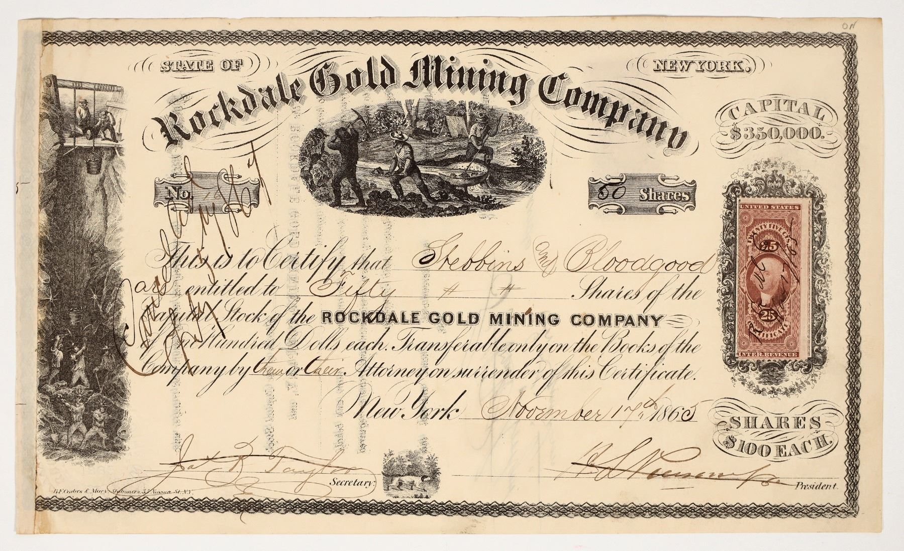 Inc. in New York. No. 16, issued for 50 shares to Stebbins & Bloodgood in November 1865. Signed by president H.L. Pearson, Jr., and J. Taylor, secretary. Pen cancelled. Black border and print. Two different mining vignettes: hoisting scene (at left) and sluicing scene (top center). 25 cent adhesive revenue stamp attached at right and on reverse. Printed Curtliss & Macy, NY. Folds. 6.25 x 10.5"Hollister describes a "Rochdale Gold Mining Company," which is most certainly the same as our Rockdale. The company had 800 ft. on the Harsh Lode at Leavenworth Gulch with 4 shafts (50-80 ft. deep); 550 ft. on the Calhoun with one 125 ft. shaft; 600 ft. on the Wood with one 80 ft. shaft; and a frame mill on the Harsh Lode. [Ref: Hollister, 1867, pg. 179-180]