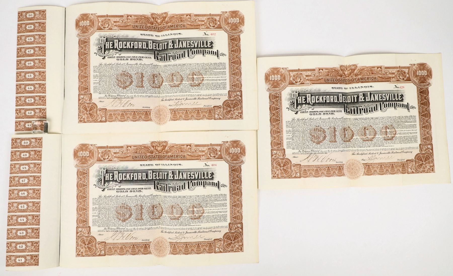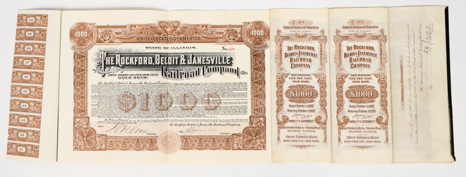 Lot of (3) bound certificates. $1000 Bond notes, listed as First Mortgage Five Per Cent Gold Bonds. Attached coupons, all redeemed except (1) row at binder. Embossed corporate seal at bottom. Larger size, half-fold. Measures 15"x10" expanded. Very good condition overall, please see photos.