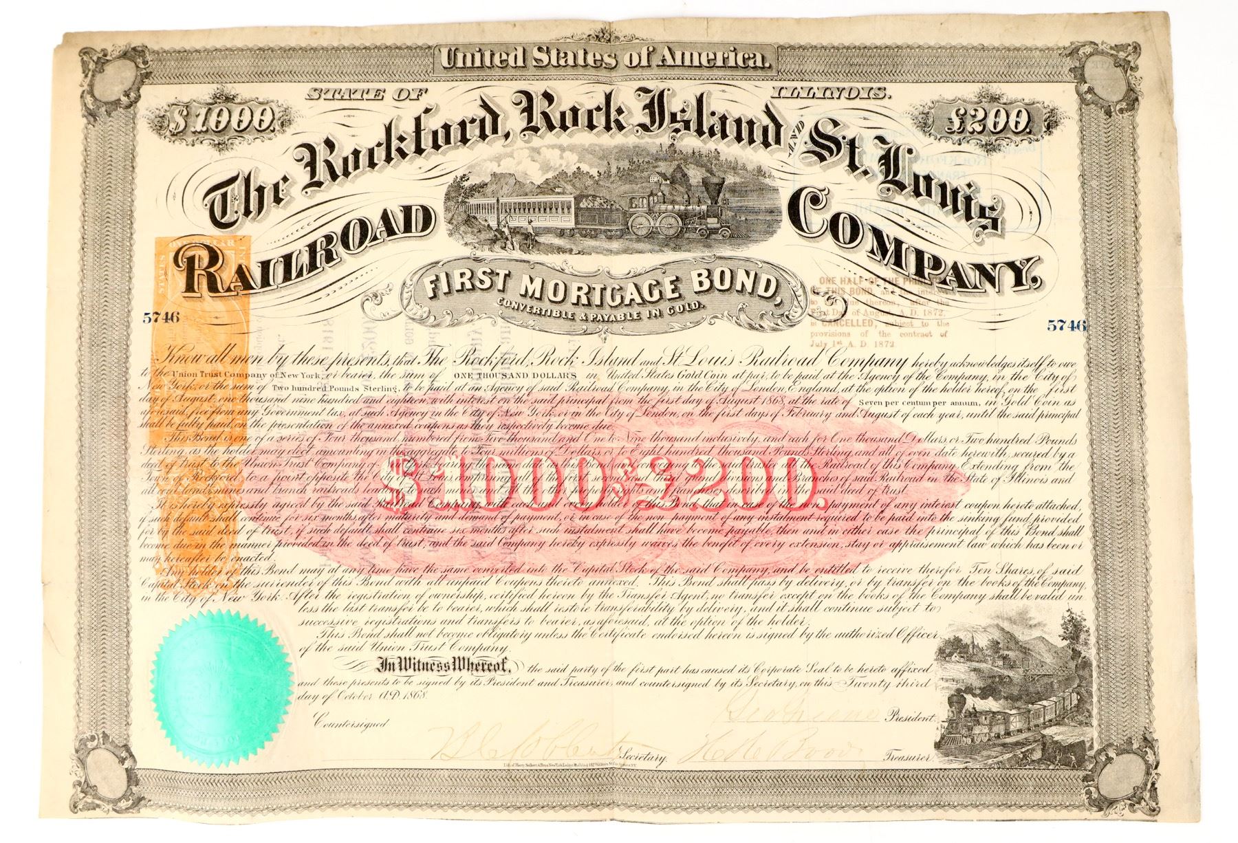 First mortgage bond convertible & payable in gold issued by The Rockford, Rock Island & St. Louis Railroad Company. Railroad vignette.