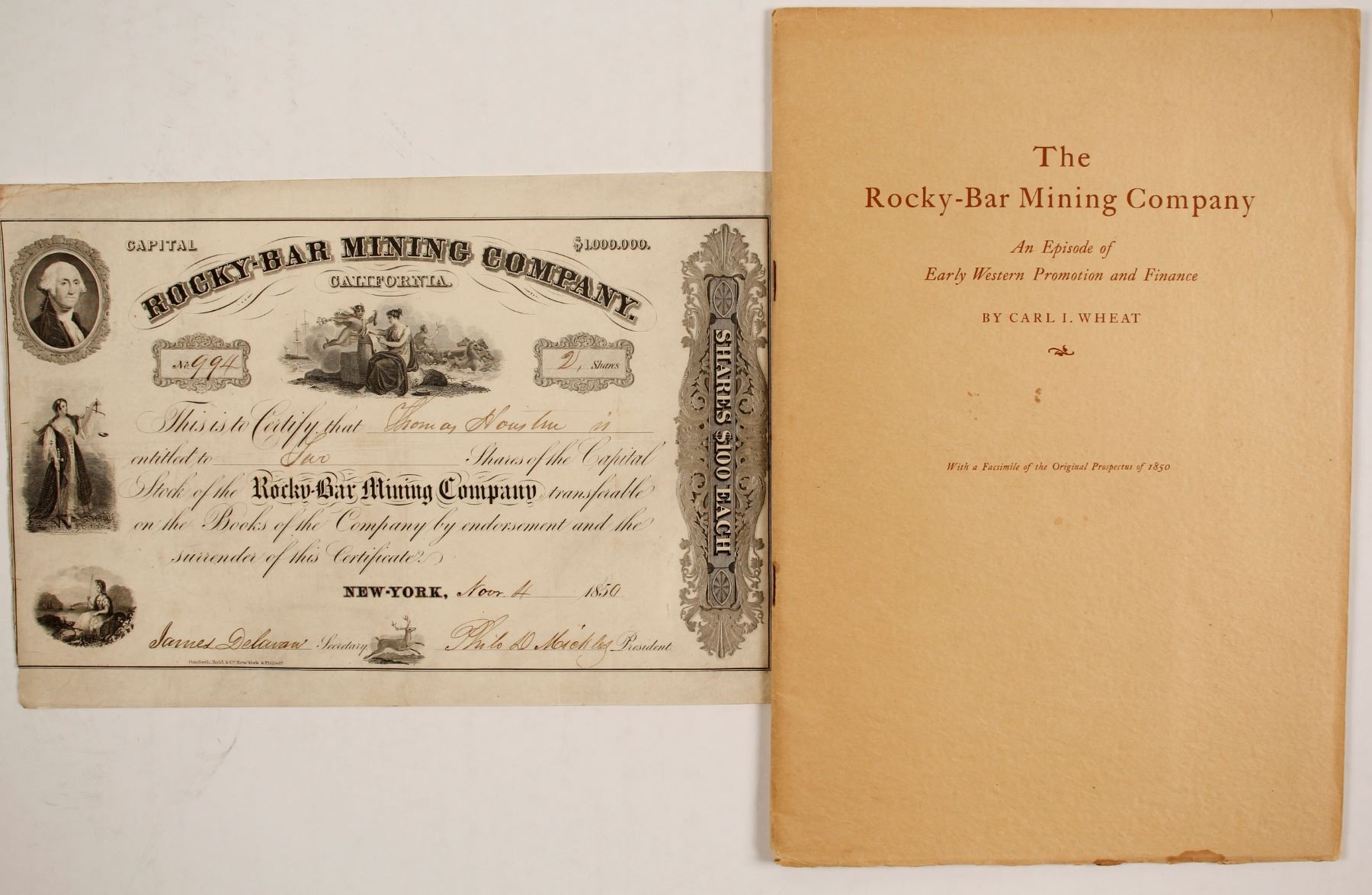 # 994 for 2 shares to Thomas Houstin(?). Signed by James Delamar and president Philo D Mickles. Dateline New York 1850. Four vignettes: allegorical, pastoral, law and George Washington. Nanforth, Bald & Co. printer. Not cancelled. Cut poorly on left. Wrinkled on right. Very nice. The Rocky-Bar Mining Company was organized in July 1849 as an association of forty miners digging for gold on the Big-Bar on the middle fork of the American River, some seventy miles from Sacramento. Comes with facsimile 1850 prospectus: "The Rocky and the Big Bars are considered by the old miners as the richest, or to say the least, among the very richest portions of the gold region in California...It is in the first place freely admitted, that all calculations heretofore made on this subject, are wholly speculative. It is however not impossible that the wildest estimates may be fully realized." Secretary Delavan, was part of an 1849 expedition as part of the Feather River Party. The band of 40 was reduced to 25 who could survive the hardships, but were rewarded with 100 pounds of gold in three weeks. [Eberstadt]. Comes with 1934 Carl I Wheat historical 12 page work. Wheat referred to the Rocky-Bar Mining Company as "the first organized project for mining quartz in California." Prag Collection State: California City: Grass Valley Date: 1850