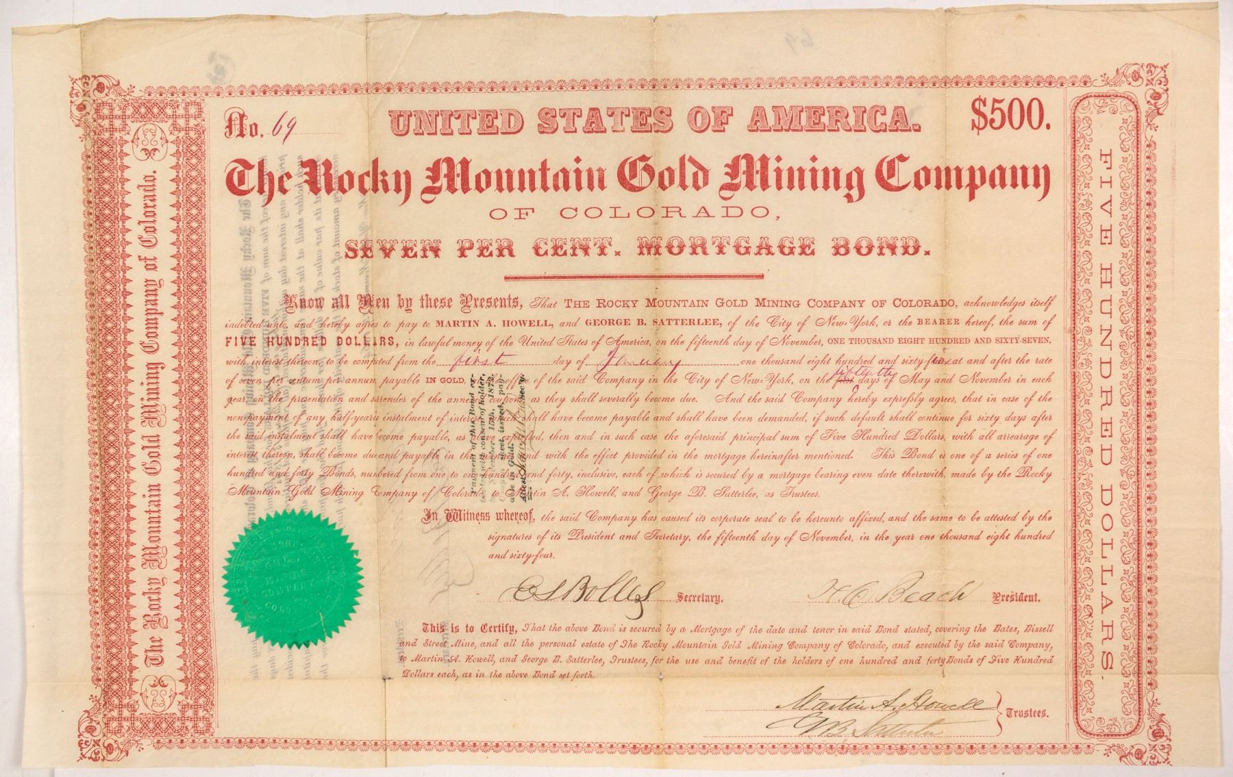 Number 69. Signed by EL Bolles secretary and HC Beach president. Also trustees George B Satterlee and Martin Howell trustees. 11 x 17.5". Stamp cancelled. Striking red print. Heavy folds, a few holes at intersections. Good condition. William Greeneberry Russell, a miner from the gold fields of northern Georgia, had come to the vicinity of present-day Denver, then part of western Kansas Territory, in 1858. Russell discovered placer gold deposits in June 1859 in the valley that was soon named Russell Gulch in his honor. By the end of September, 1891 men were mining gold in the gulch, and the eponymous town was built near the head of the gulch to serve the miners. Russell Gulch is about two miles from present day Central City.