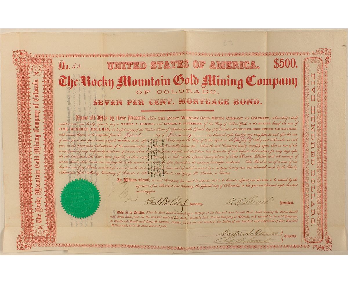 1864. For $500 to trustees Martin A. Howell and George B. Satterlee and signed by secretary Bolles(?) and president HC Beach. William Greeneberry Russell, a miner from the gold fields of northern Georgia, had come to the vicinity of present-day Denver, then part of western Kansas Territory, in 1858. Russell discovered placer gold deposits in June 1859 in the valley that was soon named Russell Gulch in his honor. By the end of September, 891 men were mining gold in the gulch, and the eponymous town was built near the head of the gulch to serve the miners. Russell Gulch is about two miles from present day Central City.City: Russell GulchCounty: GilpinState: CODate: 1864