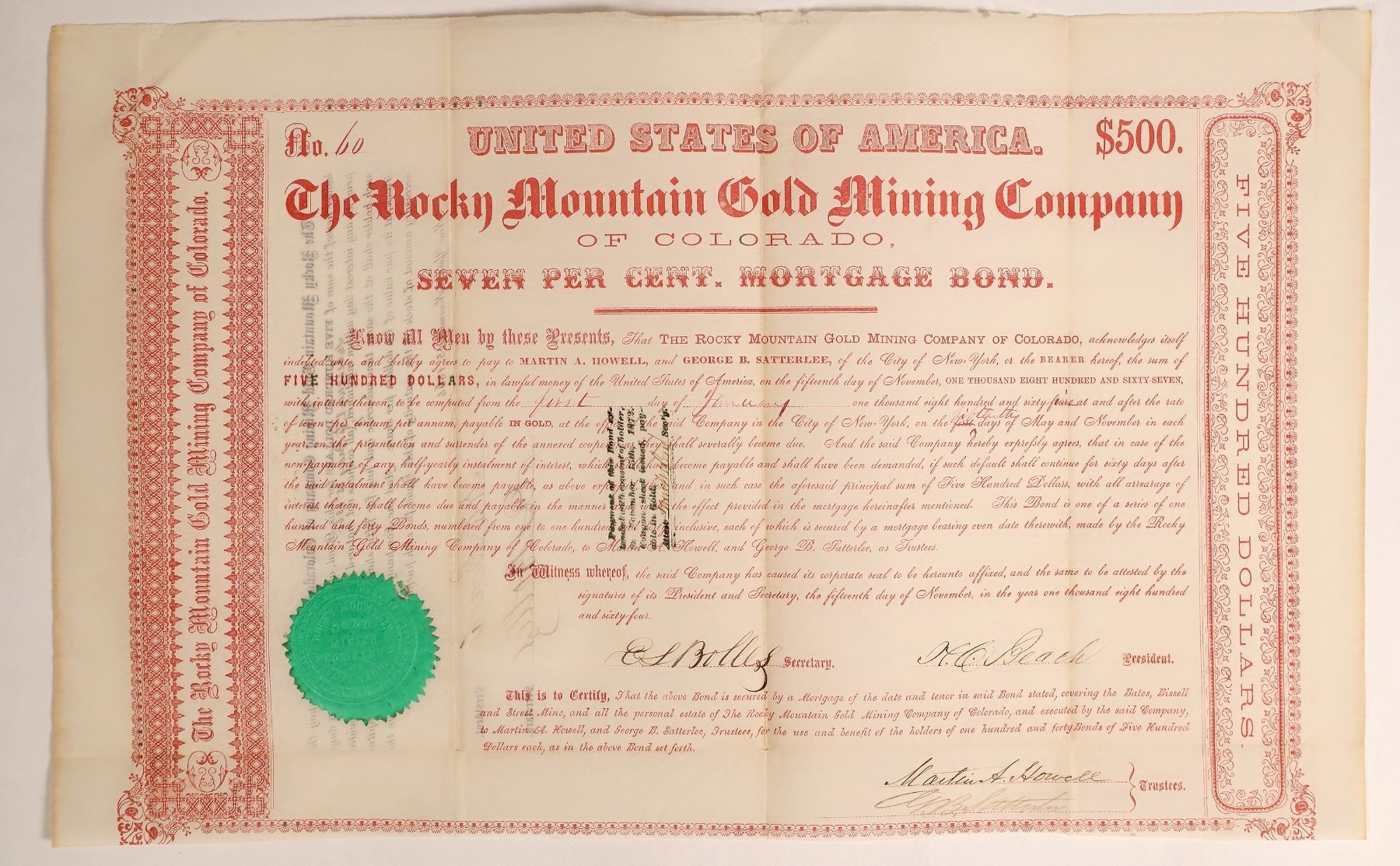 Very early. $500 bond no. 60, issued in 1864. Signed by president Beach and secretary Bolles, as well as two trustees. Not cancelled. Red border and print, green seal. 10.5 x 17" Folds, creases. Located on the Gregory lode next to the Benton, the principal lode of the Black Hawk district. In 1867 they had 2 shafts, one of which was more than 200' deep. Both shafts were run on narrow gold quartz veins. The mine and mill were inactive in 1863-6 with no local agent when Hollister reported them. Not reported in Wallihan, 1871.