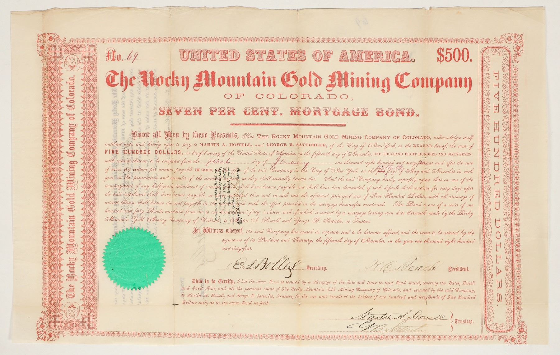 Very early. $500 bond no. 69, issued in 1864. Signed by president Beach and secretary Bolles, as well as two trustees. Not cancelled. Red border and print, green seal. 10.5 x 17" Folds, creases. Located on the Gregory lode next to the Benton, the principal lode of the Black Hawk district. In 1867 they had 2 shafts, one of which was more than 200' deep. Both shafts were run on narrow gold quartz veins. The mine and mill were inactive in 1863-6 with no local agent when Hollister reported them. Not reported in Wallihan, 1871.