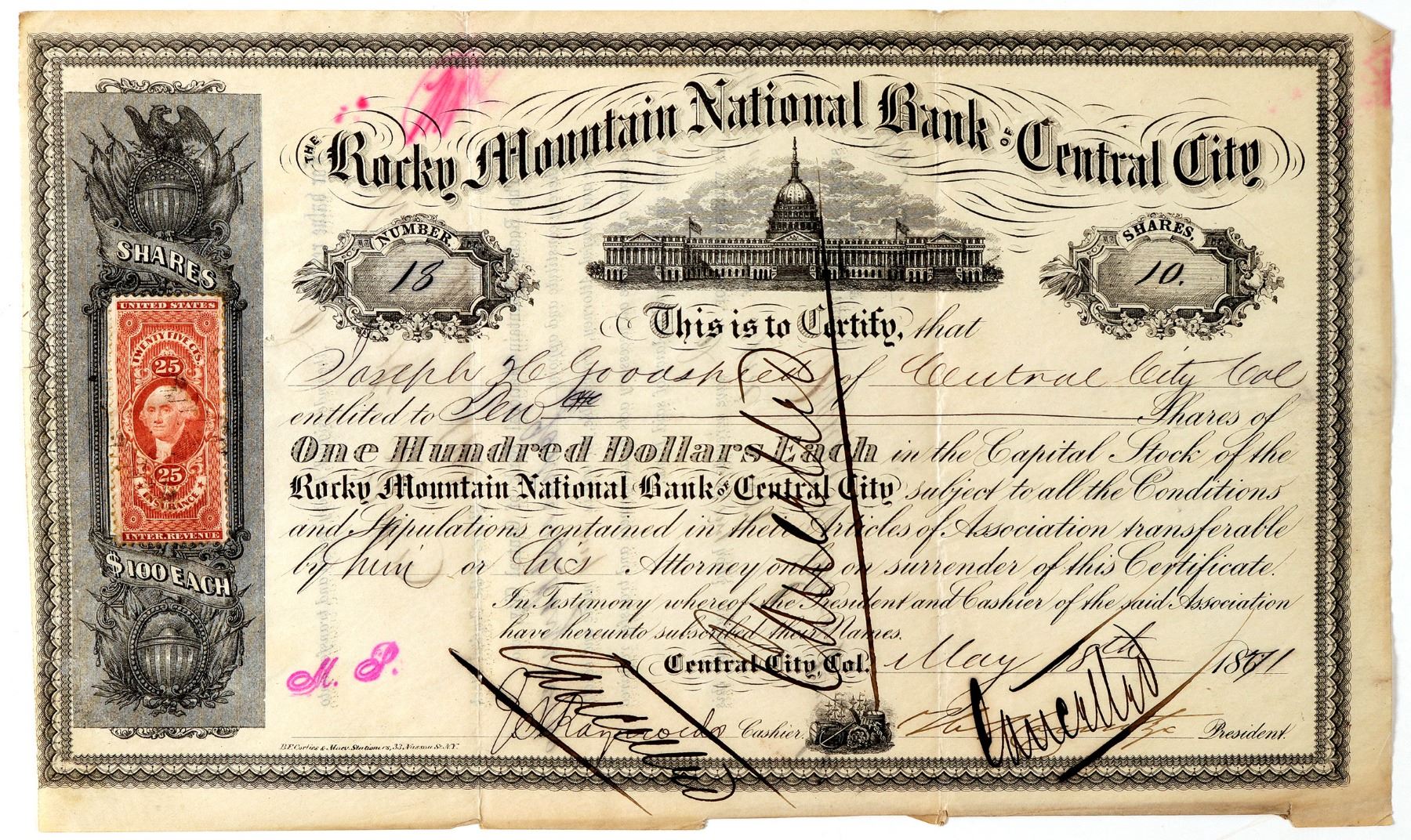 Rare issued! Low number 13, issued for 10 shares to Joseph Goodspeed of Central City on May 18th, 1871. Signed by the president and cashier J.S. Raynolds. Signatures and stock are pen cancelled. Ornate border, black print, and vignette of building. 25 cent adhesive revenue stamp attached at left. Folds, curled bottom edges, some staining. 6.25 x 10.5" Organized May 1st, 1866. Succeeded the private banking house of Kountze Brothers which had been established in 1862. J.S. Raynolds would advance from cashier and by 1880 become bank president. () Ken Prag Collection