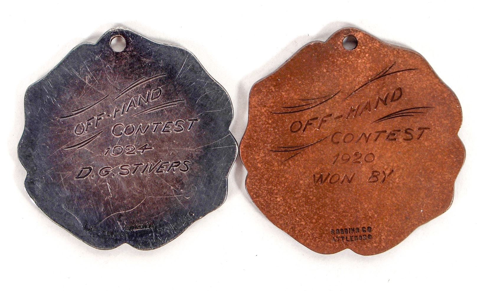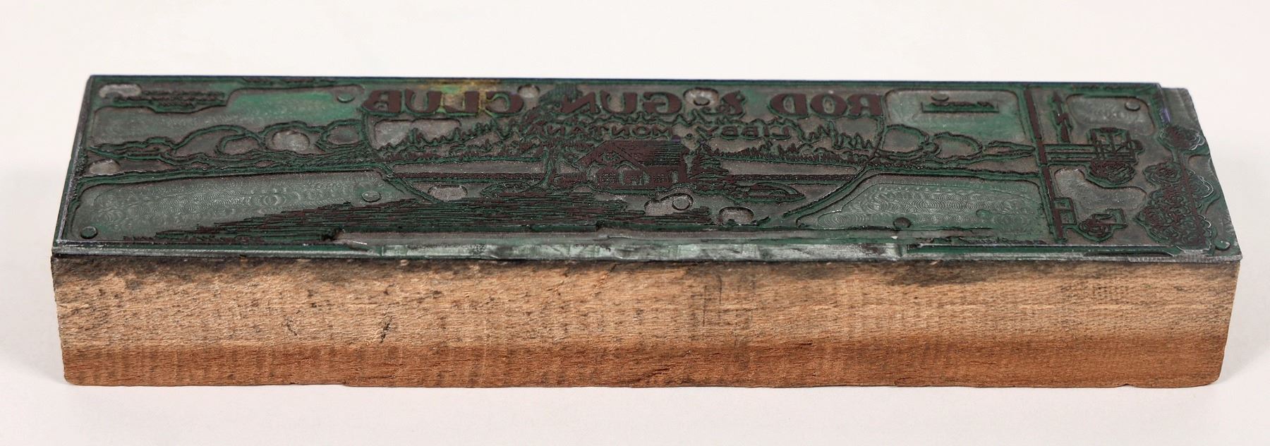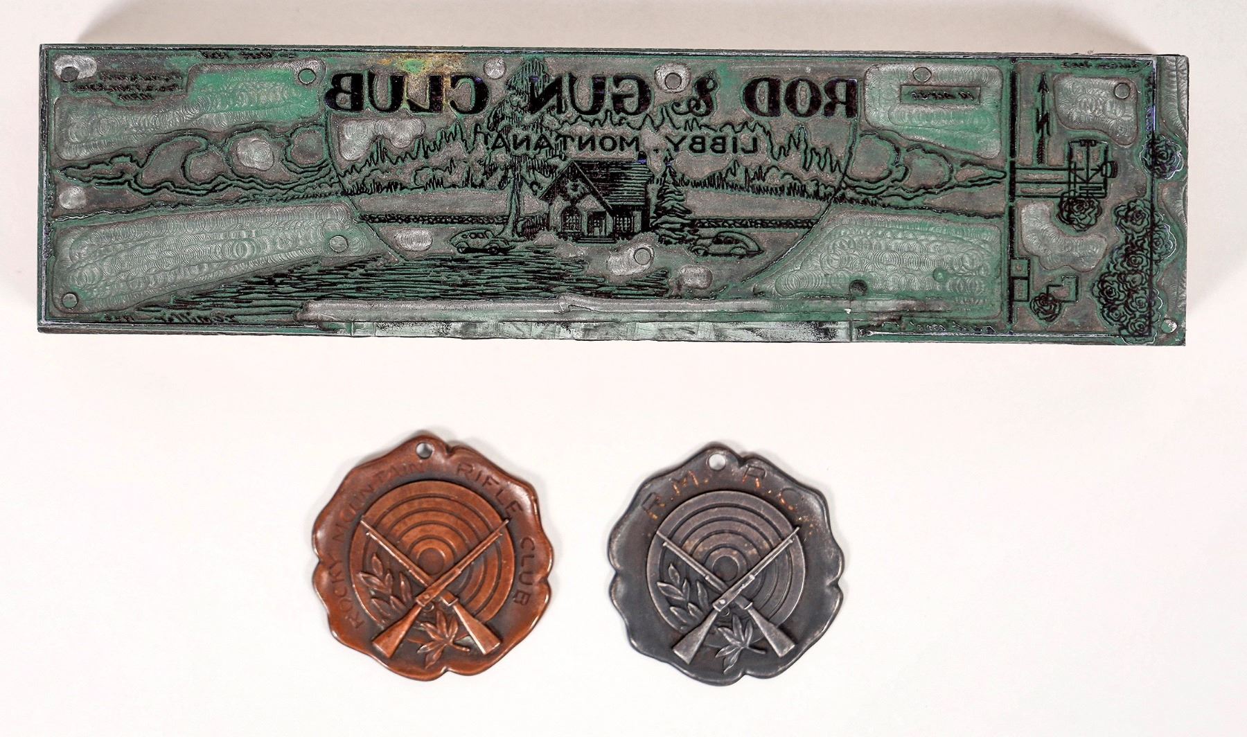 Lot of two medals from the Rocky Mountain Rifle Club: 1) Off hand contest 1920 won by (blank); copper, 35 mm, holed. 2) Off hand contest 1924 / D. G. Stivers; sterling silver, 35 mm, 14.8 grams. Also a metal printing plate on a wooden block 6 x 1 1/2 inches, from the Rod & Gun Club of Libby, Montana, to create a bucolic letterhead of a hunting cabin in Montana.