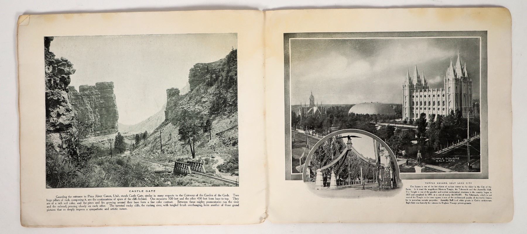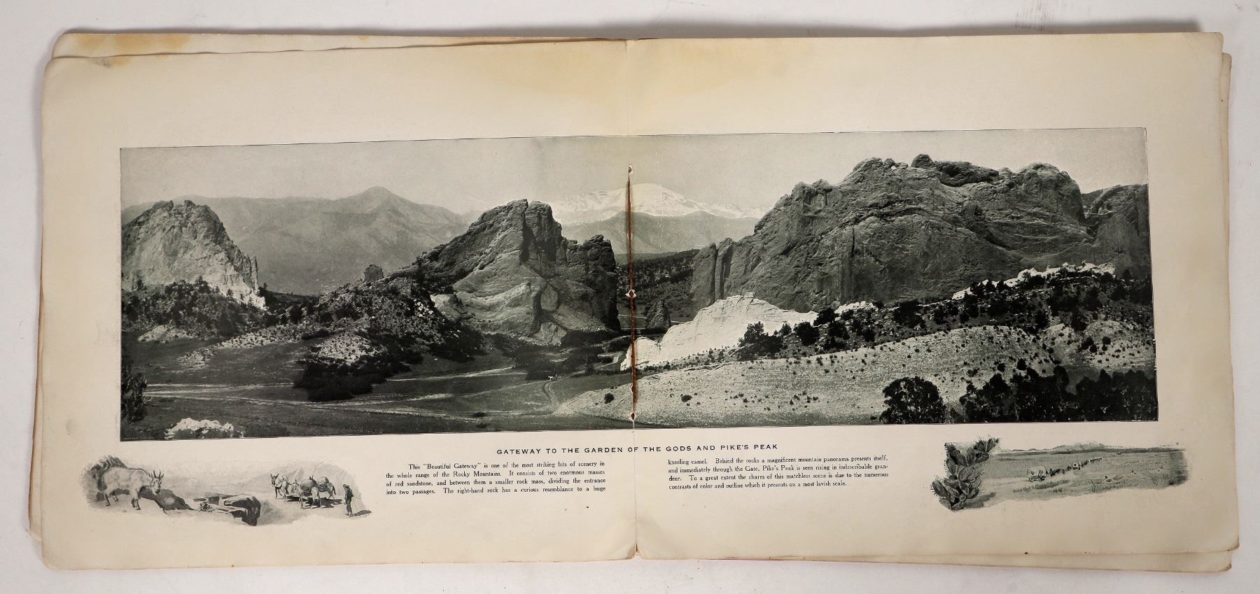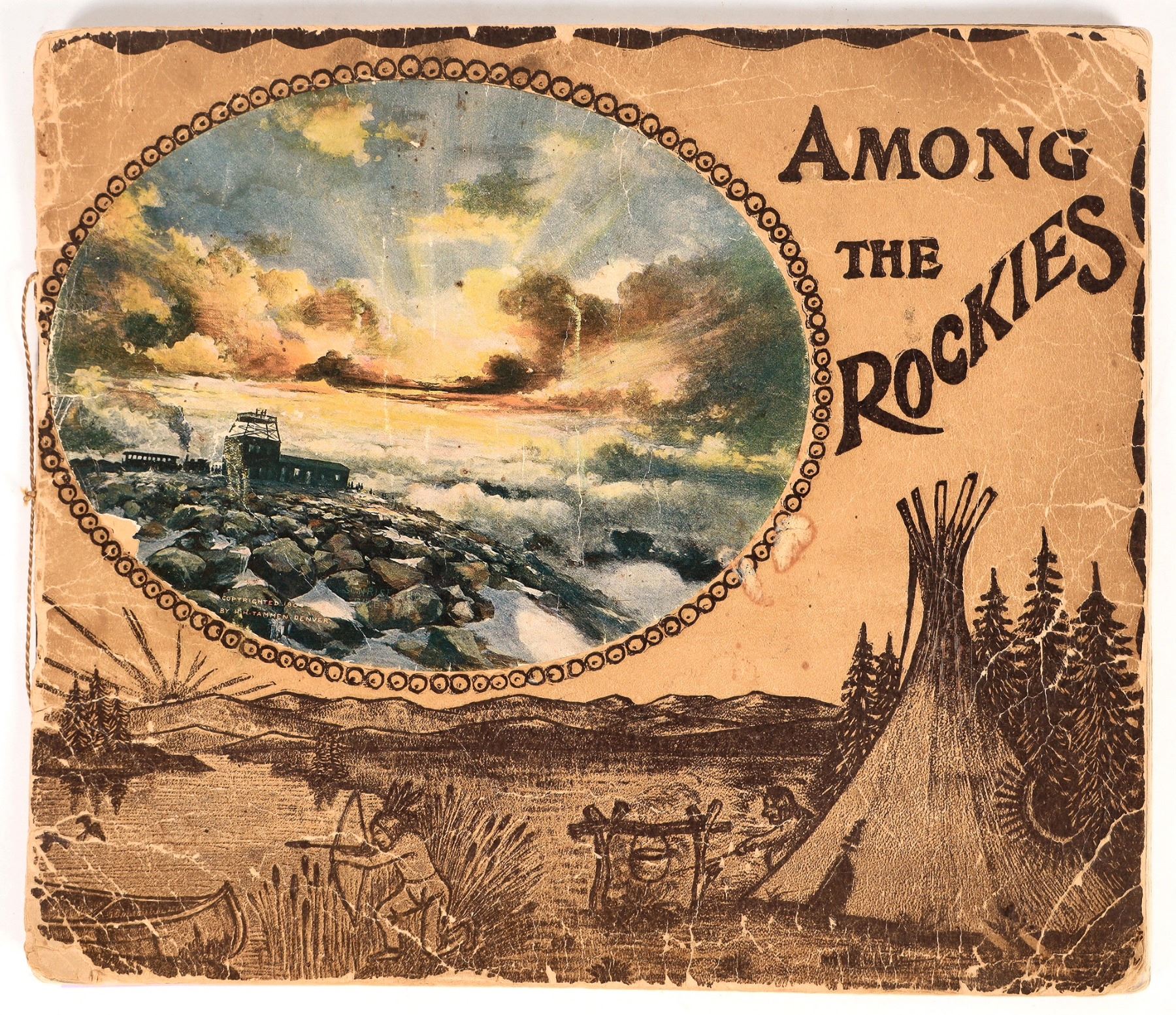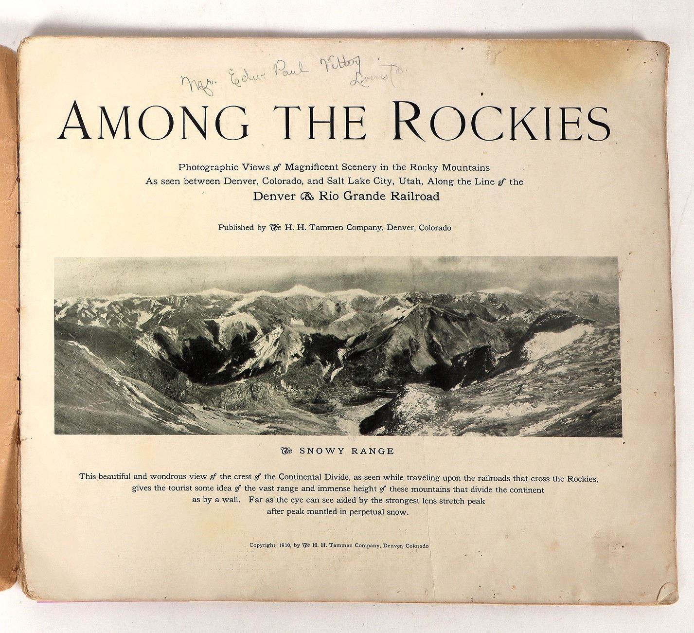 A copy of 'Among The Rockies: Photographic Views of Magnificent Scenery in the Rocky Mountains', published in 1910 by H.H. Tammen Company of Denver, CO. Softcover, 36 pages. The book contains dozens of quality B&W photos taken along the line of the Denver & Rio Grande Railroad. Includes some great nature views as well as settlements such as Salt Lake City. Extensive wear on cover, foxing at edges of most pages.