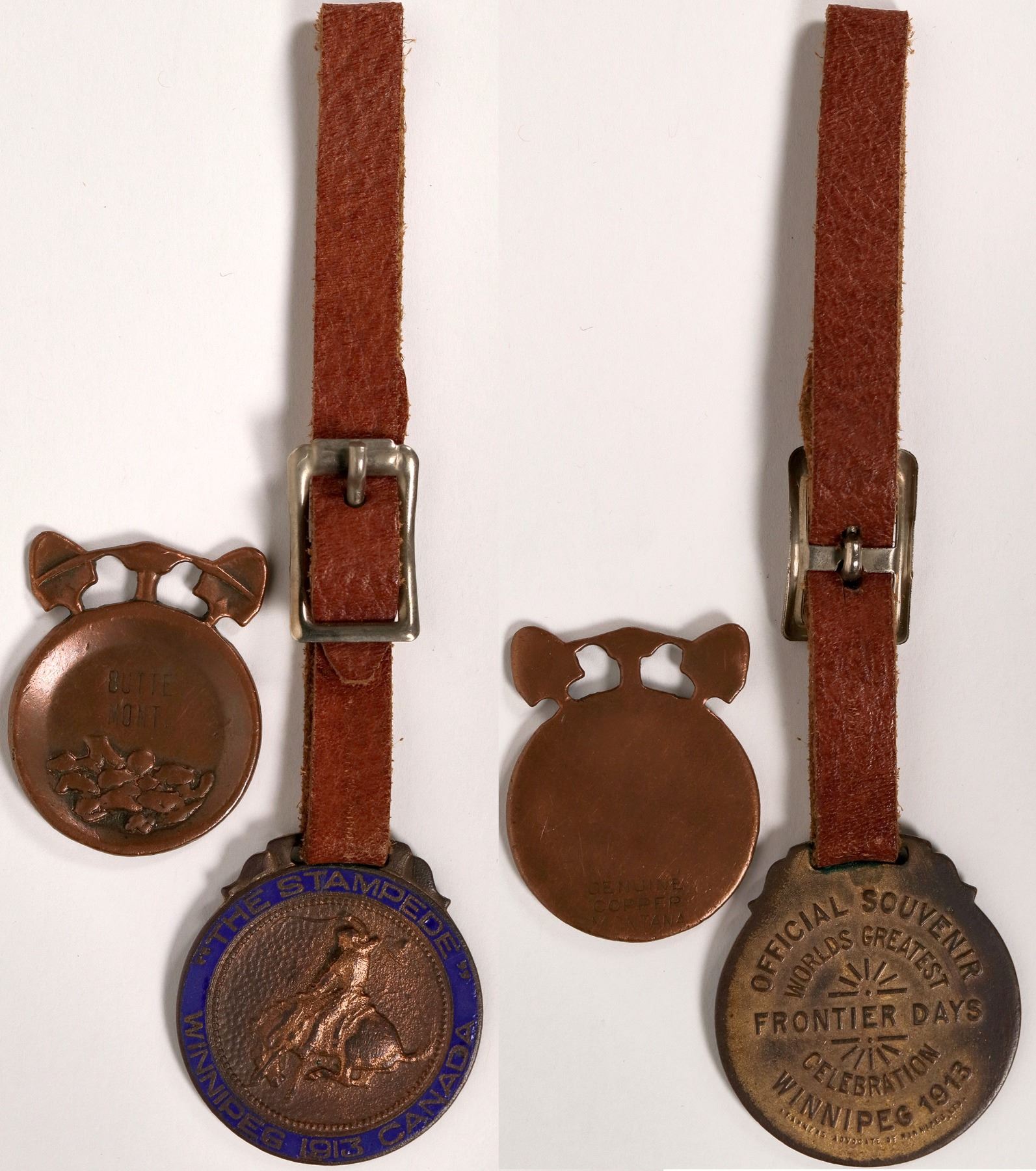 1) "official Souvenir, World's greatest, Frontier Days, Celebration, Winnipeg, 1913." Reverse says "The Stampede / Winnipeg, 1913, Canada." Blue border. Very nice condition with leather strap. RODEO related. 1 & 3/4" diameter. 2) Butte, Mont. gold pan with pick and shovels. "Genuine Butte Copper".1 1 1/4" diameter.