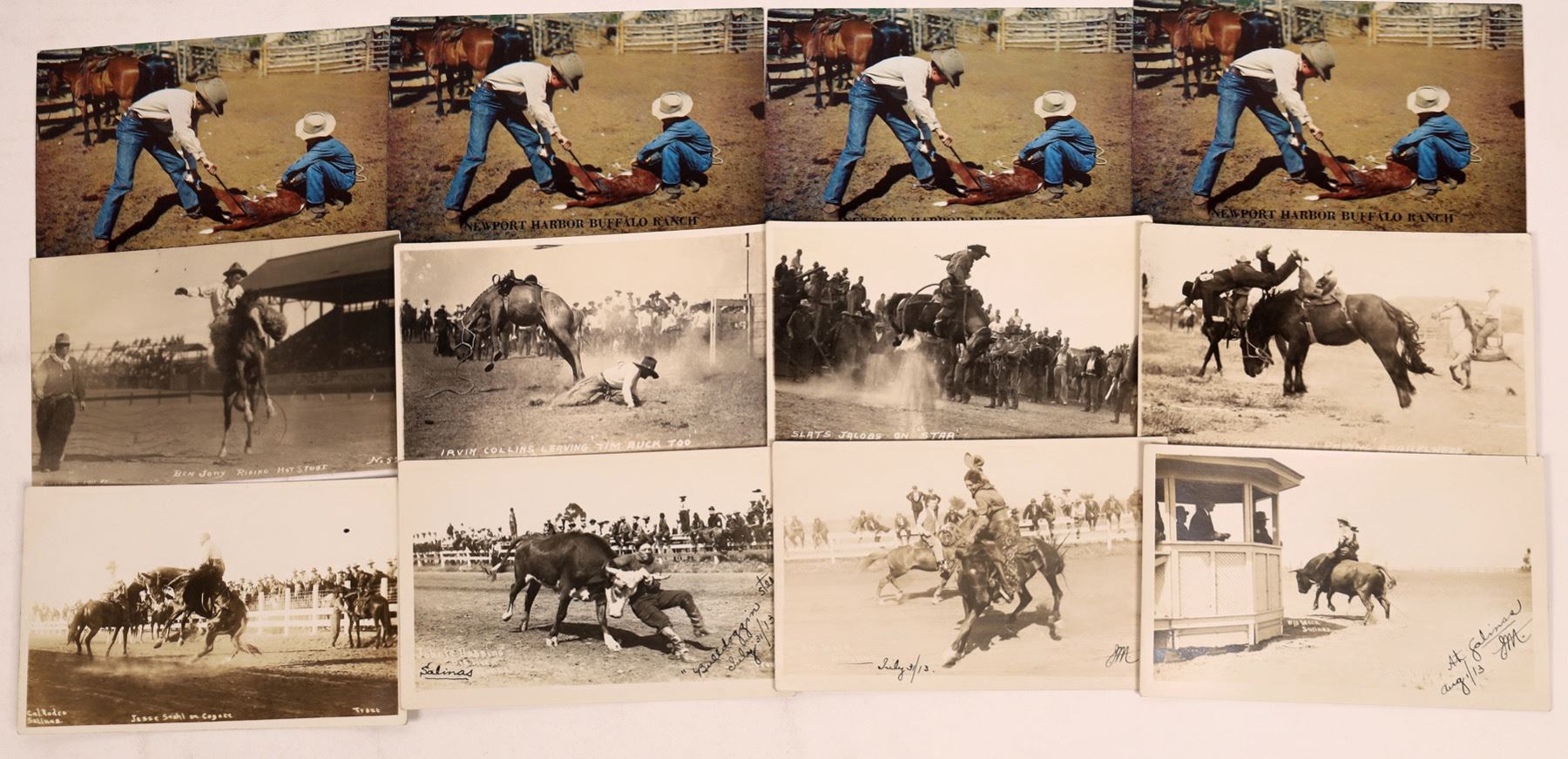 Eleven RPC action scenes: two J. M. 1913, three Doubleday naming cowboy on bucking bronco, 1911 Ben Jory on Hot Stuff. Four duplicate Newport Harbor Buffalo Ranch color postcards.