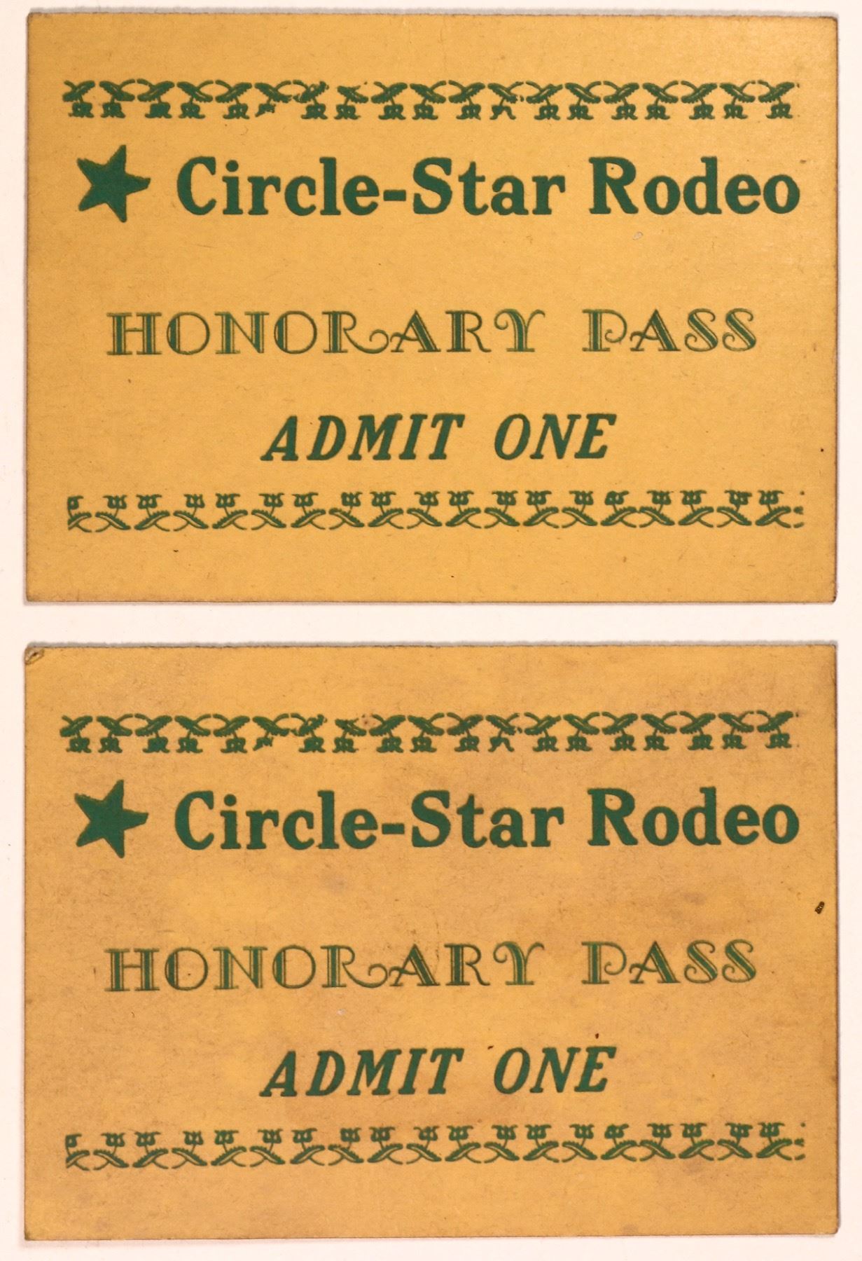 A pair of honorary passes to the Circle-Star Rodeo (2), undated. No information could be found on location. The 3.5" x 2.5" tickets are printed in blue-green with decorative trim above and below the text, which reads: Circle-Star Rodeo/HONORARY PASS/ADMIT ONE.