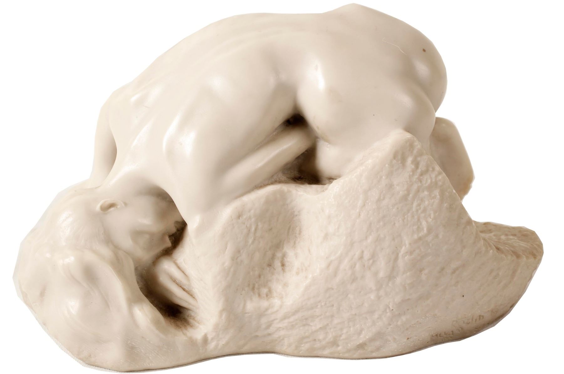 Alabaster female nude made in the style of Rodin's Danaide of a female lying down. Soft features. 7 x 7 x 13" State: City: Date: HWAC# 86215