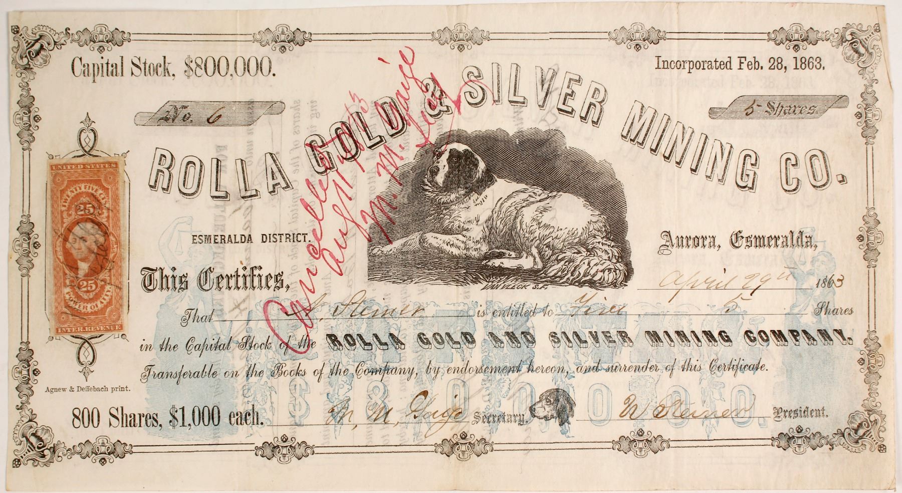 VERY EARLY # 6 for 5 shares to A Steiner. Signed by MM Gaige and president N Steiner. Dateline Aurora, Esmeralda 1863. Incorporated February 28, 1863. Pen cancelled. Light blue underprint, 'Capital &800,000.' Allegorical women and fancy scroll work. Van Vleck vignette of a Saint Bernard. Agnew and Deffebach printer. Van Vleck was a wood block craftsman in San Francisco. Located in the Esmeralda District. 25c Power of Att'y Revenue stamp. Dog ear upper and lower right. Very Nice condition! Gaige & Steiner were also partners in the Sazerac Saloon on Fine Street in Aurora, "fitted it up in a style unsurpassed in the Territory..." They sold wines and liquors and had a billiard table. [Aurora, Nevada 1860-1960 by Shaw] Prag Collection State: Nevada City: Aurora Date: 1863 HWAC# 82013
