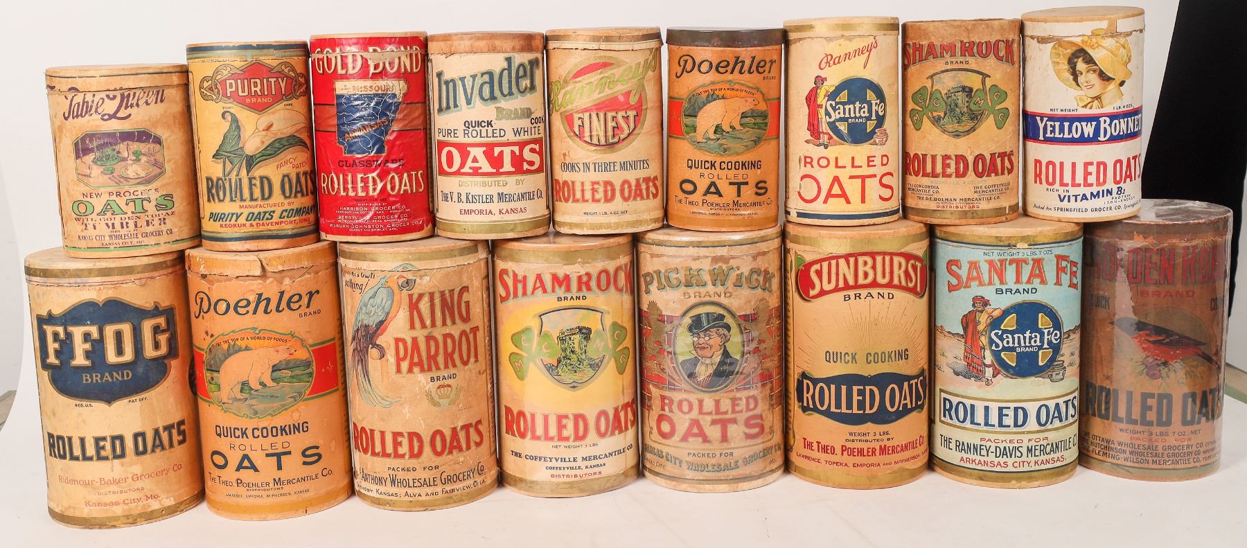 17 different c. 1900-30 paper rolled oats containers, about 7" and larger. Yellow Bonnet, Gold Bond, Invader, Poehler, Shamrock, Pickwick etc. See photo. Gary Bracken Collection