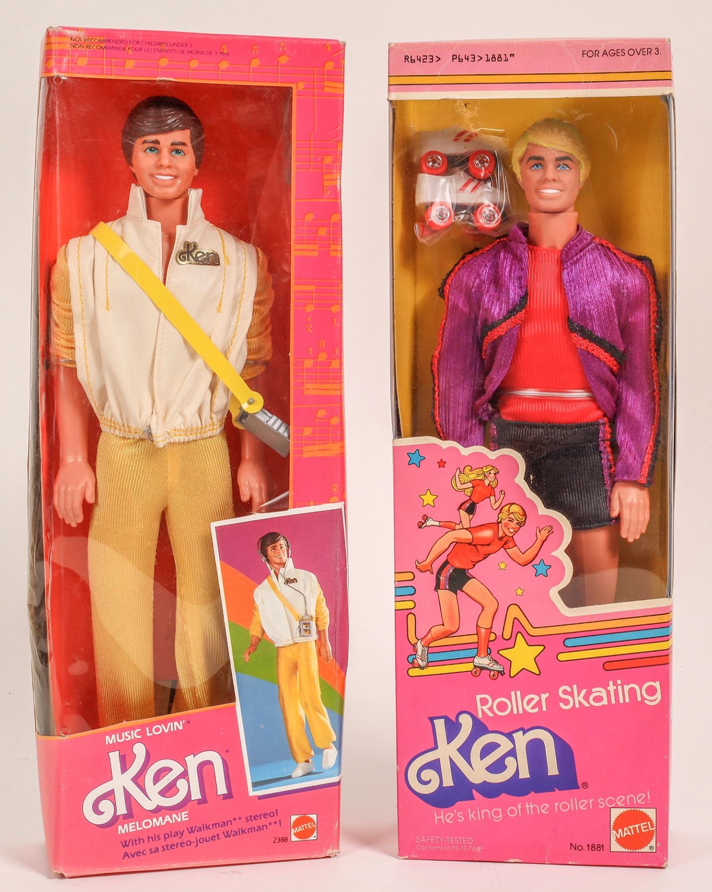 New in box Mattel Ken dolls. Music Lovin' Ken Melomane with his Walkman, # 2388. Roller Skating Ken with pair of roller skates. #1881.