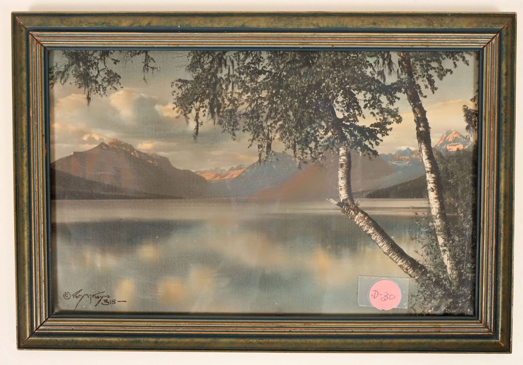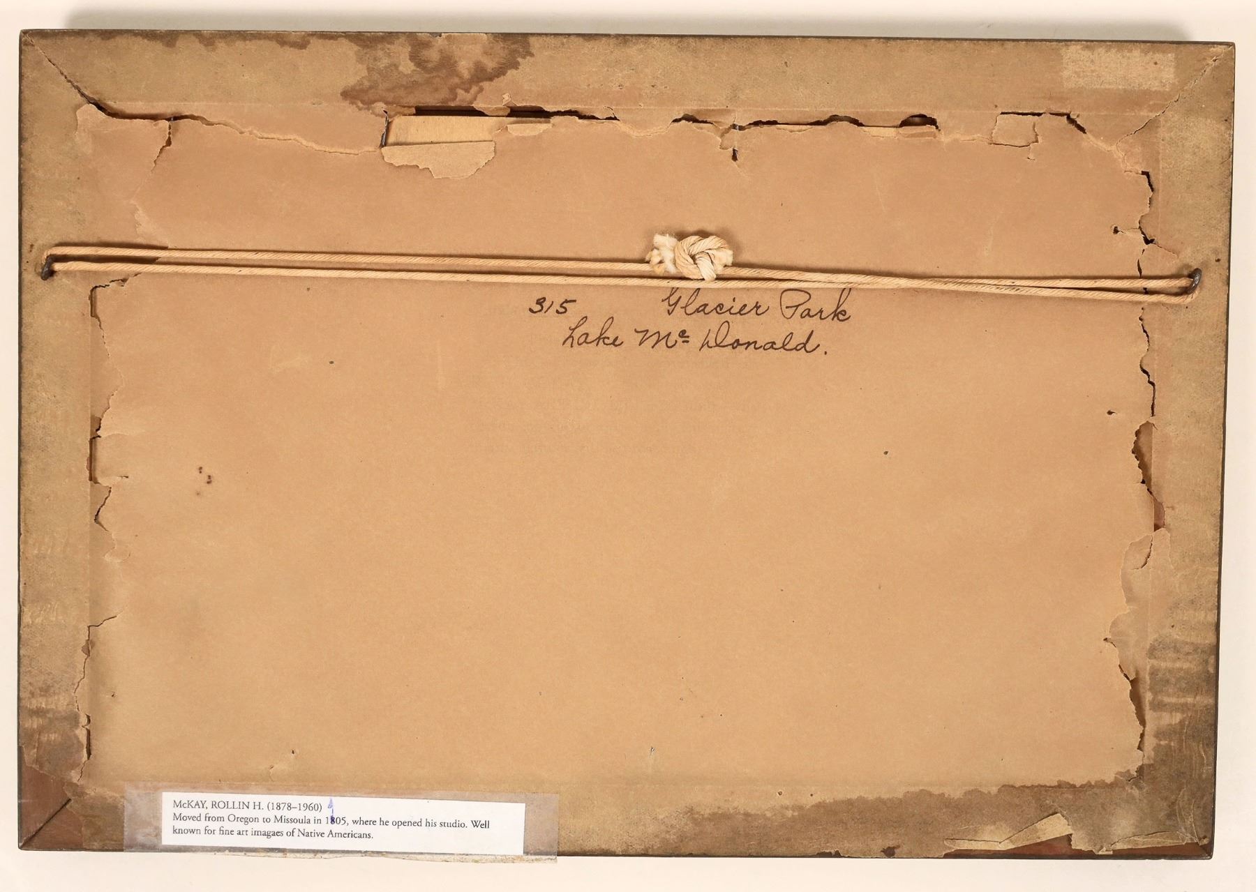 A framed, colored photograph of Lake McDonald, a lake in Glacier National Park in Montana by American photographer Rollin H. McKay. It is signed by McKay. The photo depicts a calm day on the lake, with a tree hanging over the water in the foreground. McKay (1878-1960) moved from Oregon to Missoula in 1905, where he would open a studio and make a career of documenting landscapes and towns across Montana. He was also known for his fine art images of Native Americans. The image is in excellent condition, and the reverse side of the frame bears a note with the images' location and a short bio of McKay.