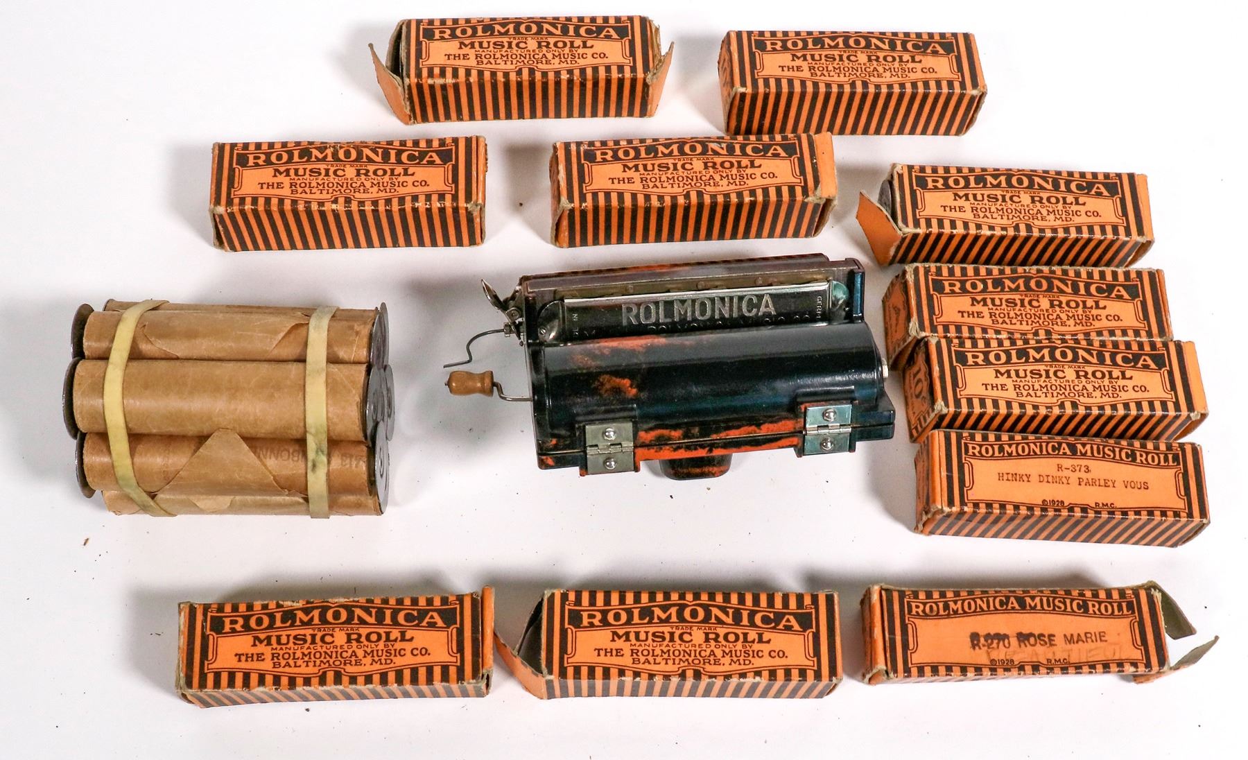 Very rare Rollmonica with 10 rolls of music in original boxes and 7 rolls without boxes. "The Rolmonica Music Company created this instrument by mounting a removable 12-note harmonica made in Germany into a hinged Bakelite (plastic) frame. The frame has a simple crank mechanism and a mouthpiece to simplify playing tunes from paper rolls that sold for 10 cents each. The Rolmonica was patented and introduced in 1928, and marketed with a package of four rolls for just one dollar. The performer had to only turn the crank and blow. While the idea of self-playing instruments operated by a paper roll was popularized by the piano, such technology was applied almost every type of instrument imaginable from player banjos, harps, accordions, and saxophones to violins. It is surprising to find the player technology applied to the harmonica since it was already a universally simple instrument to play. Considered to be an inexpensive novelty or a musical toy, it was sold as "a player piano in your pocket." from https://americanhistory.si.edu. Missing 1 wood handle.